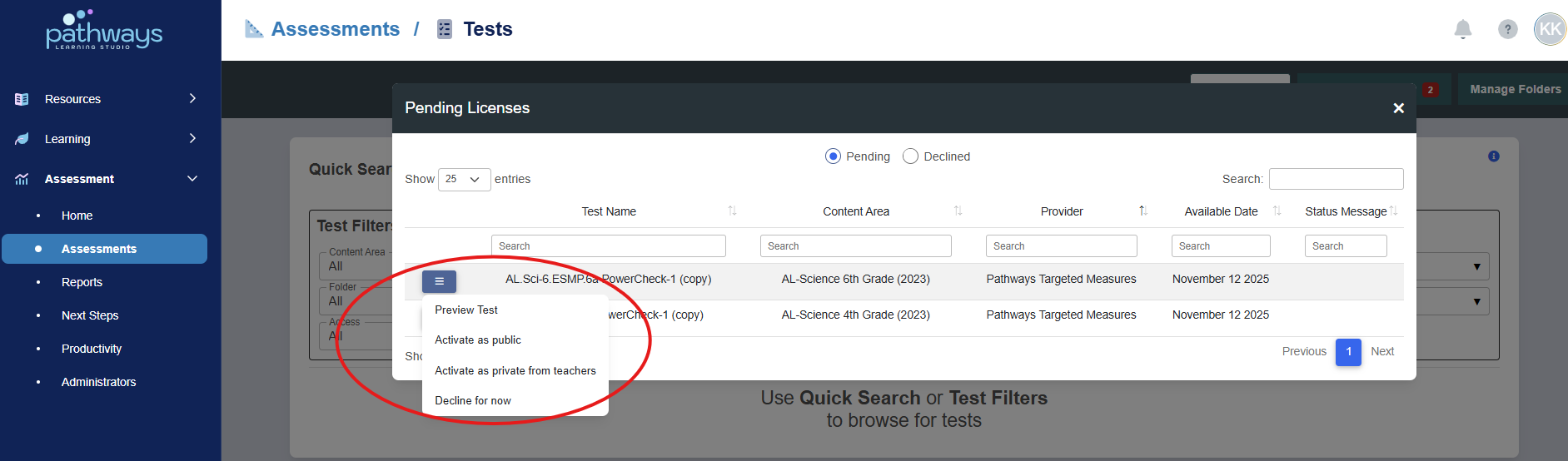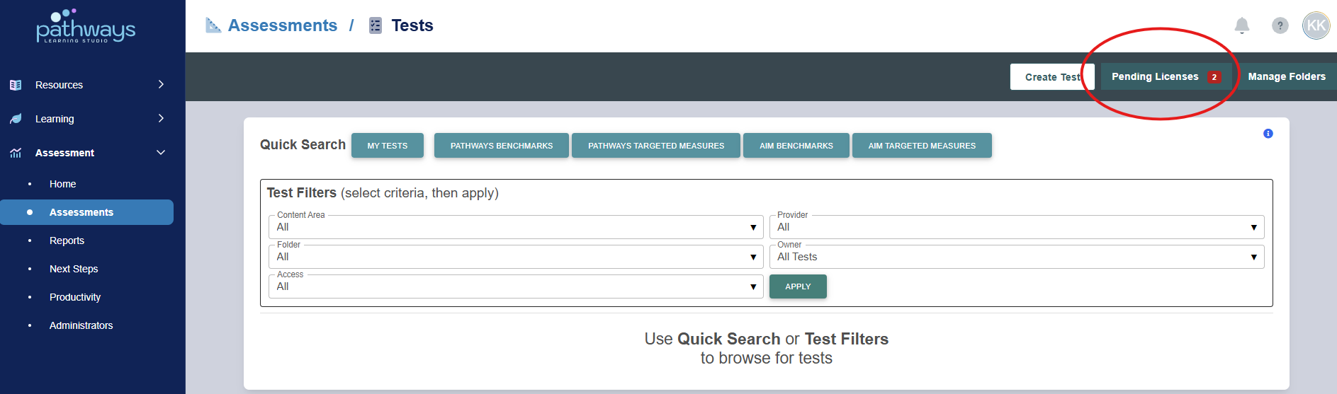 6. After clicking 'Pending Licenses,' the administrator can review the options by assessment by clicking the collapsed menu to the left of each test name.
