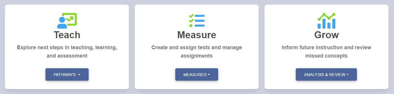 In the Pathways to Proficiency portal, there are three categories: Teach, Measure, and Grow: