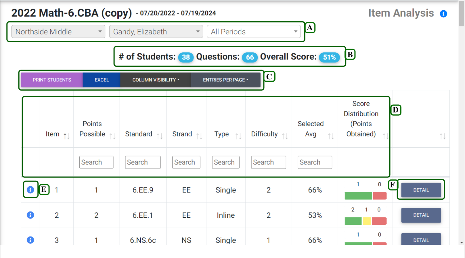 - Score Distribution: Green= full credit for the item, Yellow = partial credit for the item, red = no credit for the item.
