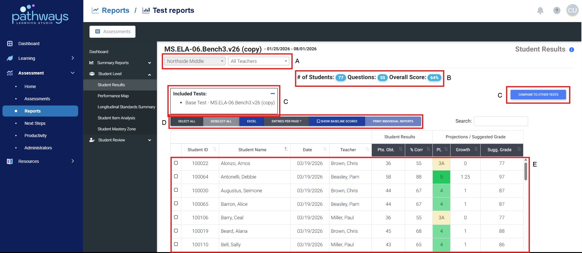 - Assessments included in this report (columns for additional assessments can be added by selecting ‘Compare to Other Tests.’)
