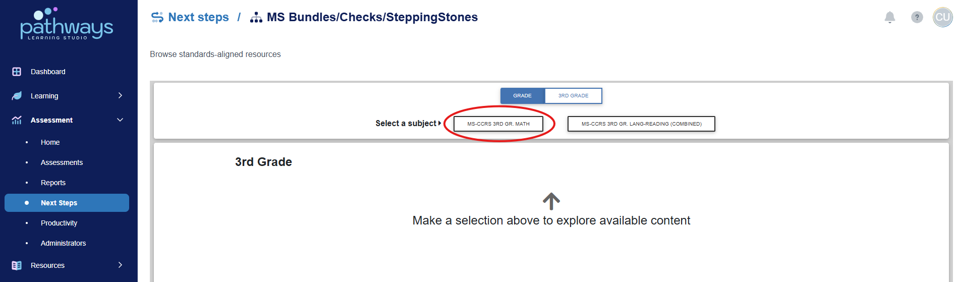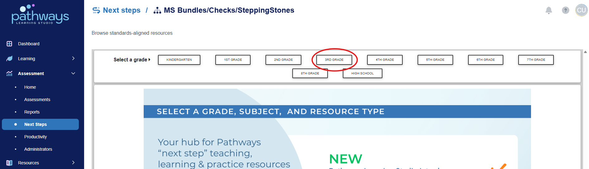 5. At the top of the page, select your desired grade level and subject (as well as strand and standard if available).