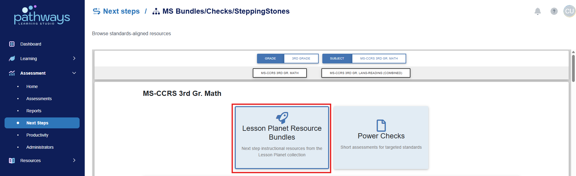 6. Select 'Lesson Planet Resource Bundles' to view the available resources for each standard.