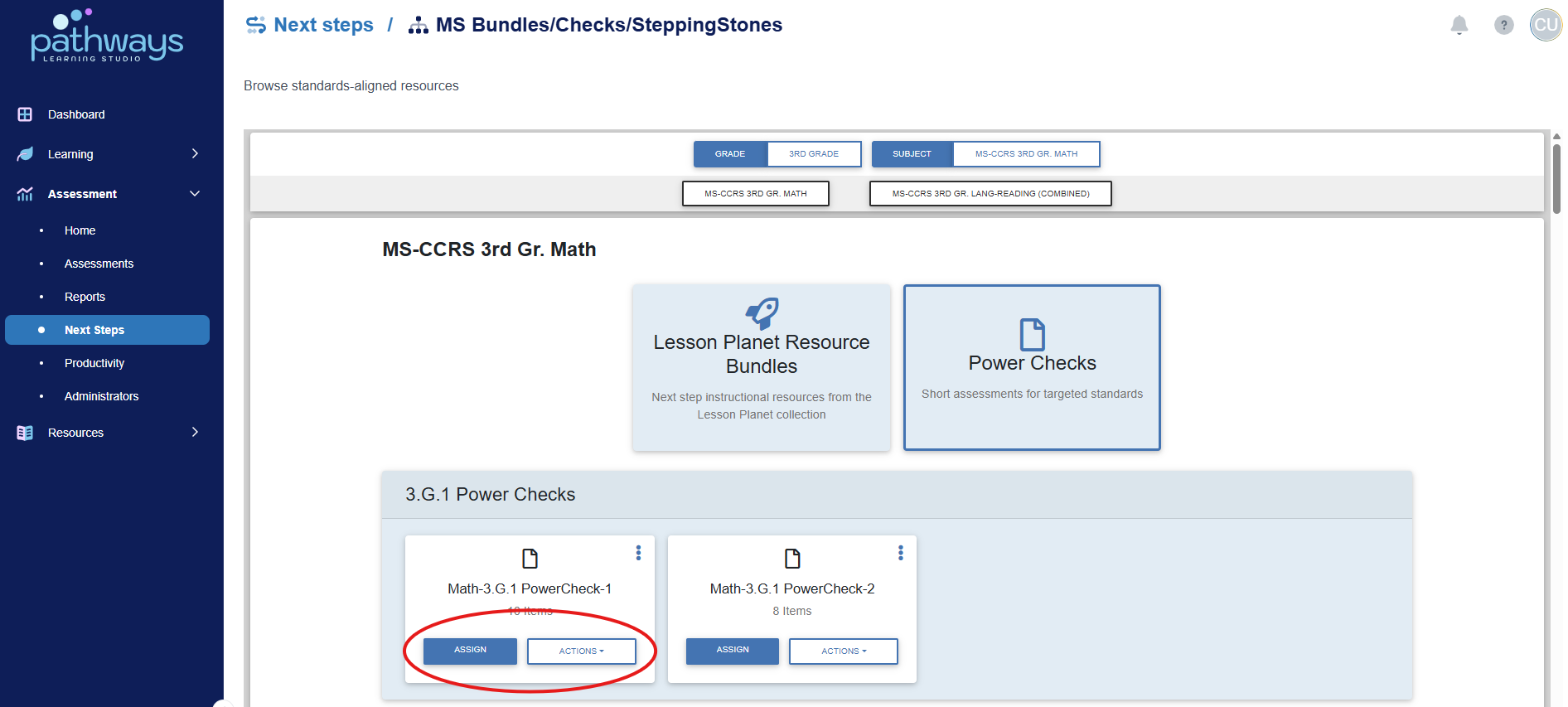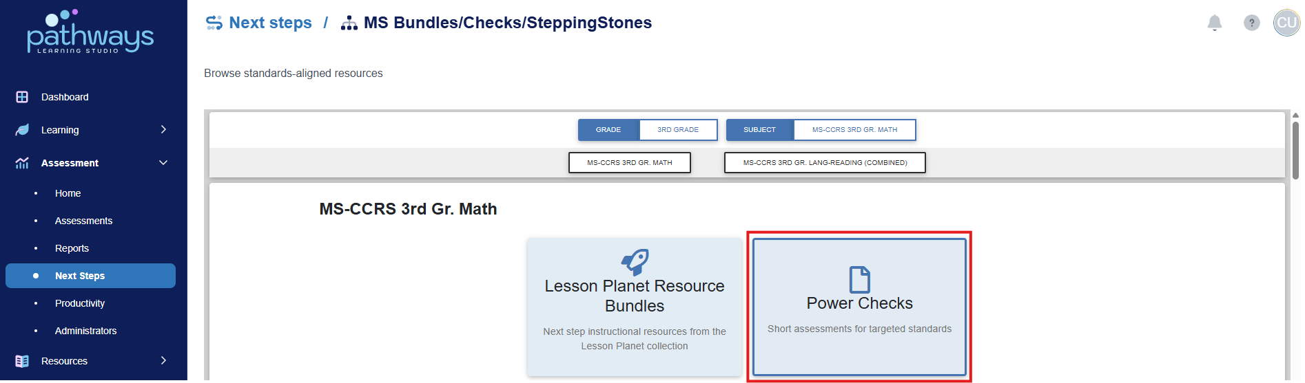 After reviewing assessment reports, you will gain an understanding of the specific strands or standards that students need reinforced. The Pathways portal does not have student specific reviews, but rather holds standard and strand specific reviews referred to as “Power Checks." Power Checks are 8-10 question reviews that can be printed as a worksheet or assigned as an online test.