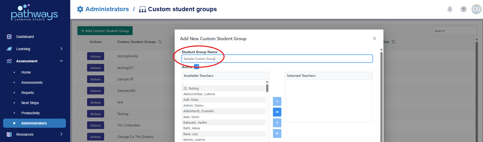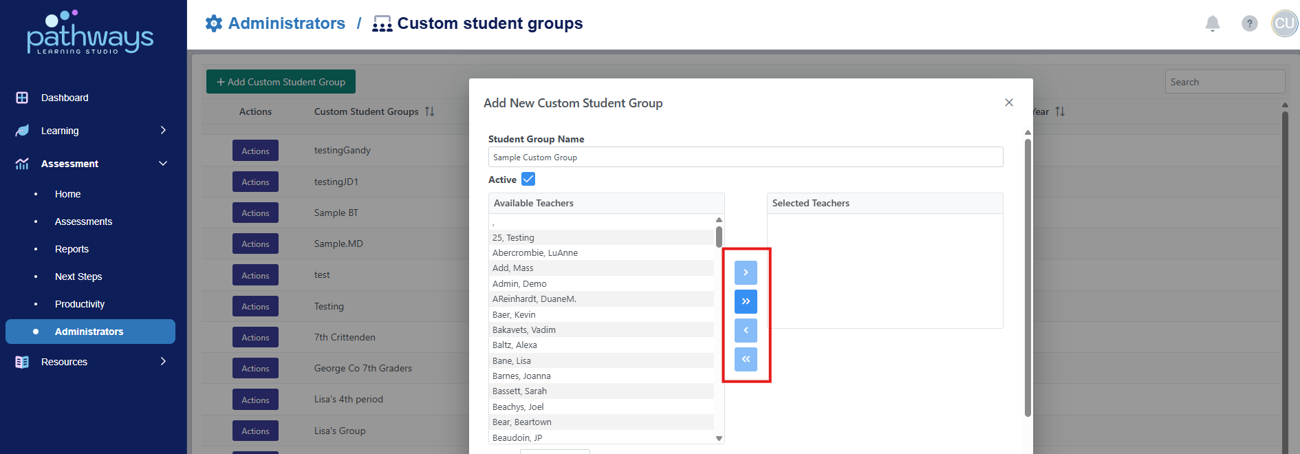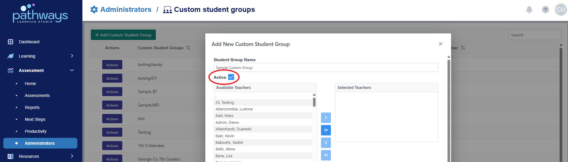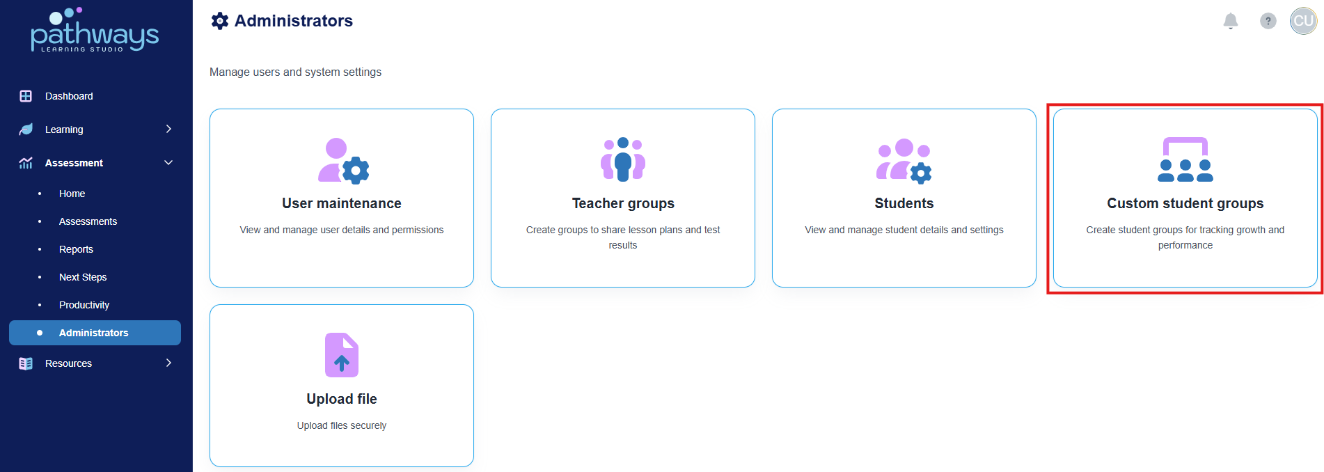 4. Select 'Custom student groups' from the Administrators dashboard.