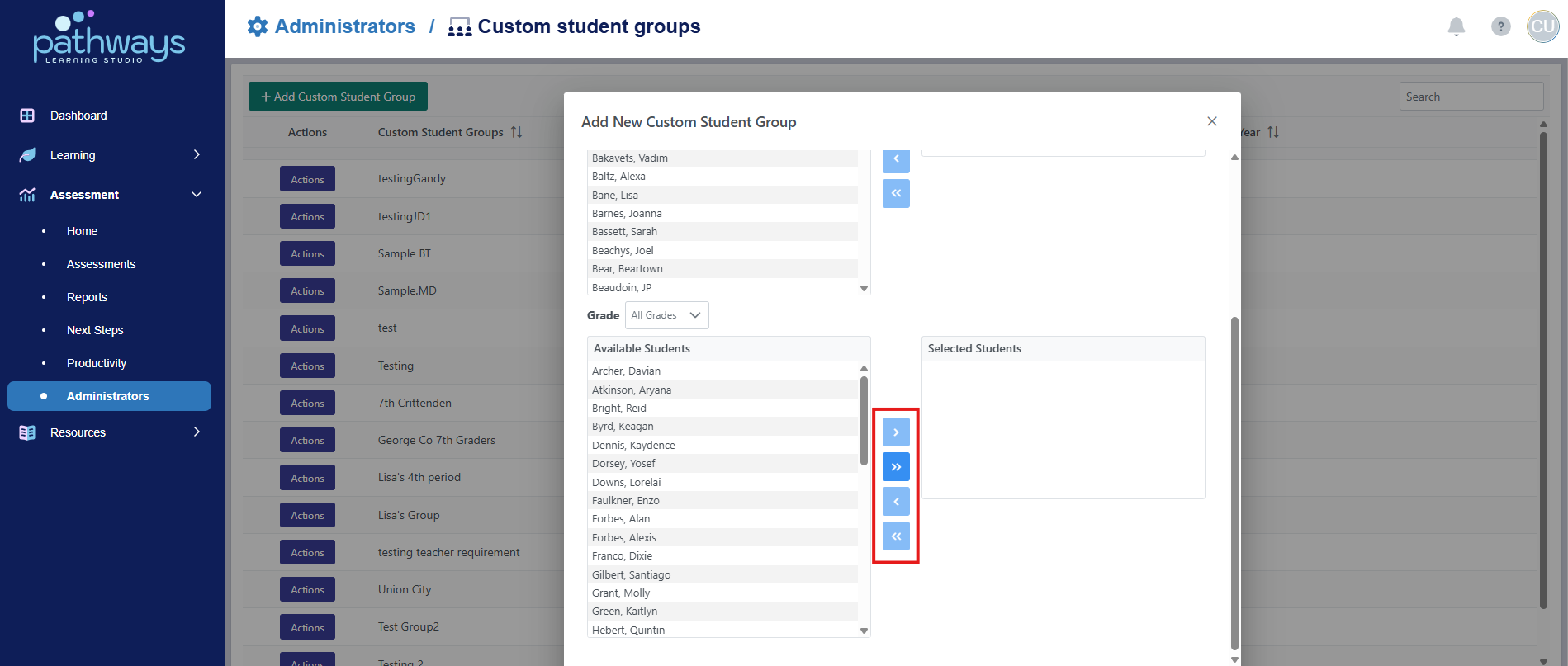 9. Click on the desired student names then click ‘>’ to add the student(s) or click ‘>>’ to add all students.