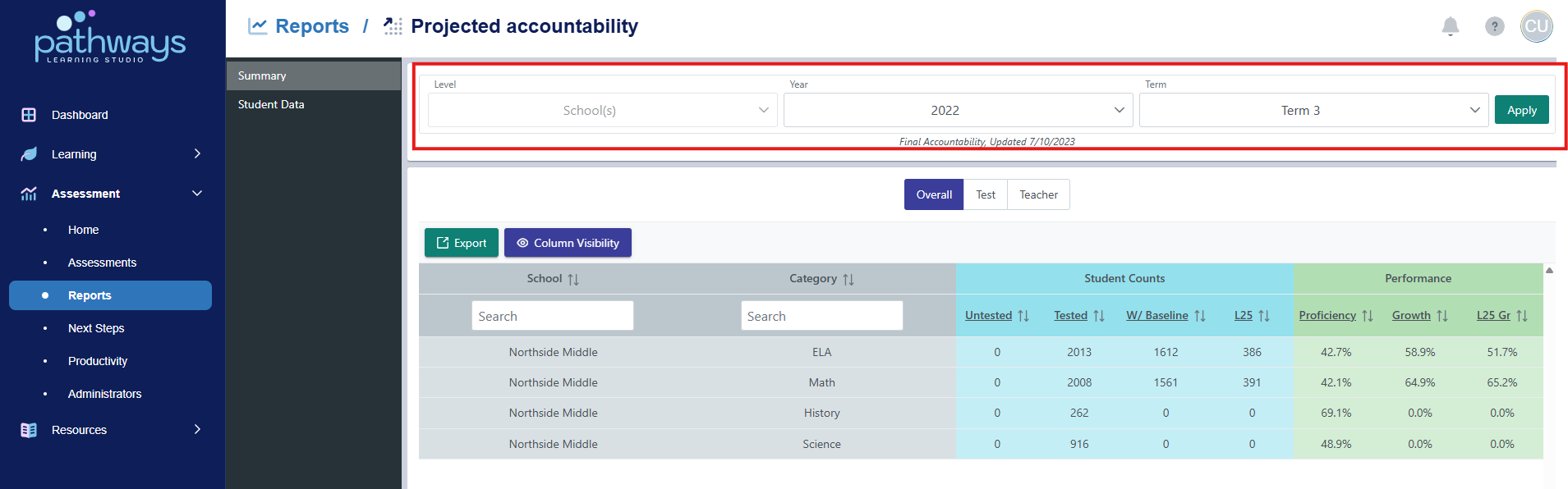 6. Choose how you would like to view the assessment results: by ‘Overall’, by ‘Test’, or by ‘Teacher.’