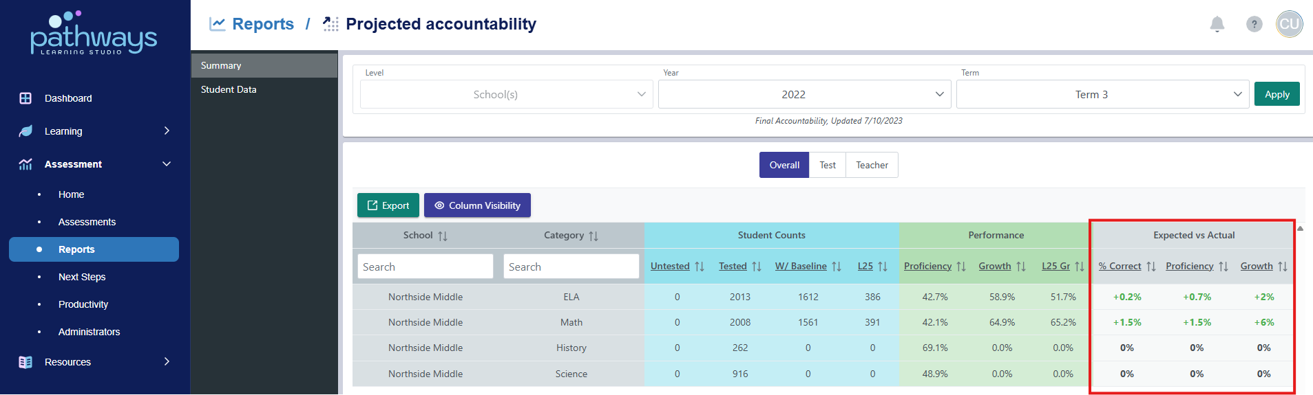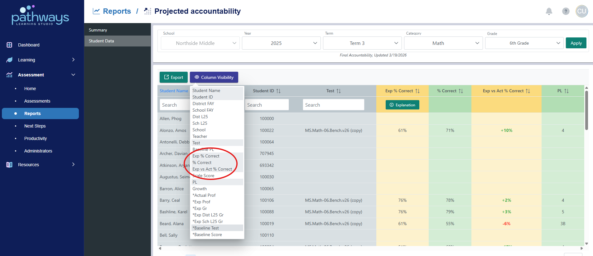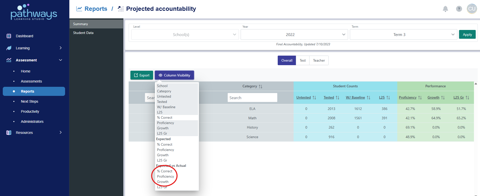 7. Select ‘Column Visibility,’ and choose ‘Pct Corr,’ ‘Proficiency,’ and ‘Growth’ under the ‘Exp vs Act’ section in the drop down menu.