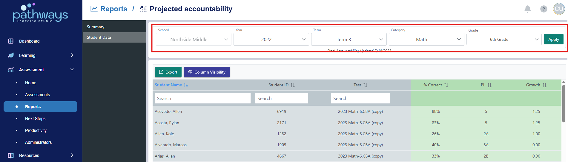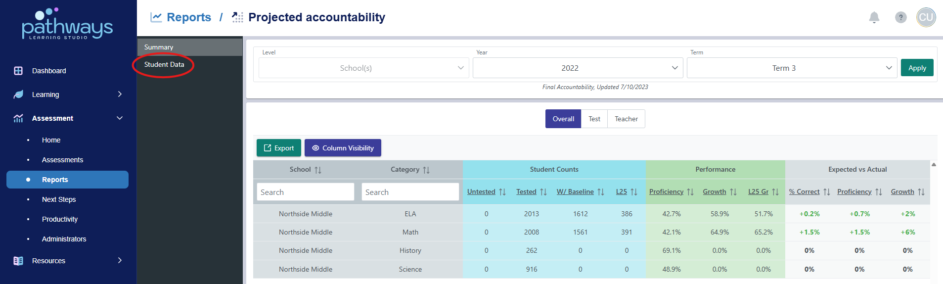 9. To view Expected vs. actual for specific students, choose ‘Student Data’ in the left side dashboard.
