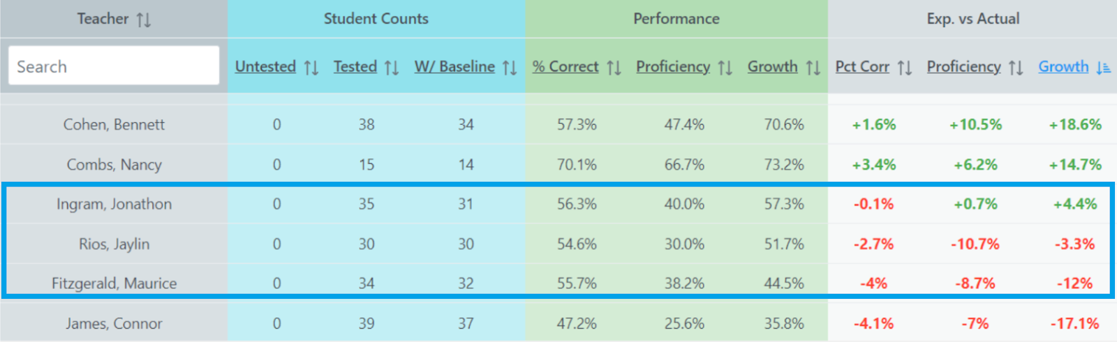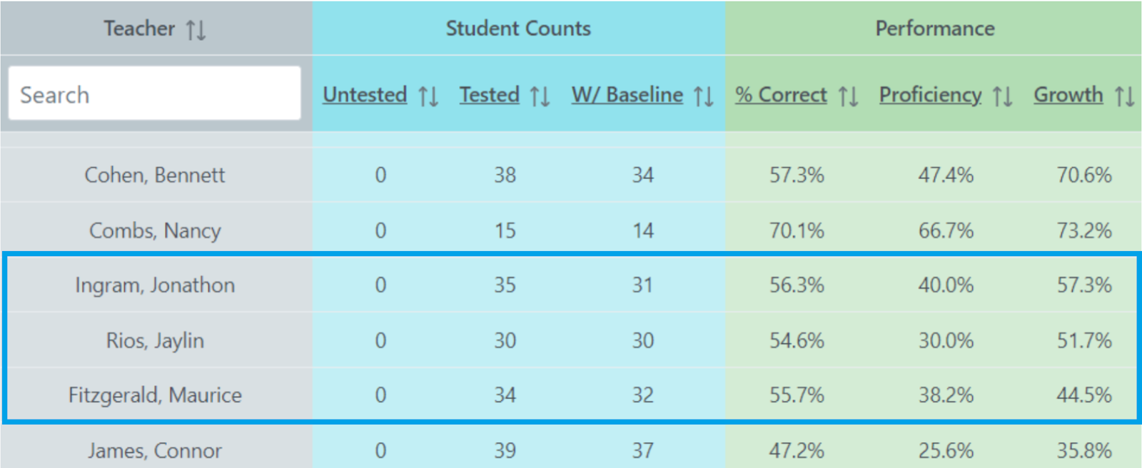 For example, if an administrator observed the following data from Benchmark results, they may assume that Jonathon Ingram, Jaylin Rios, and Maurice Fitzgerald all had classrooms that performed similarly on their Benchmark exams: