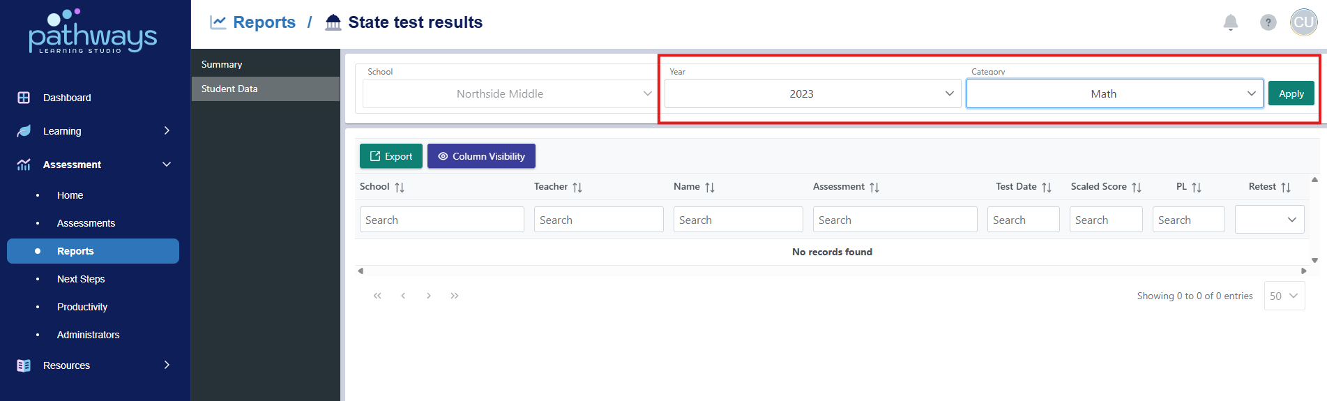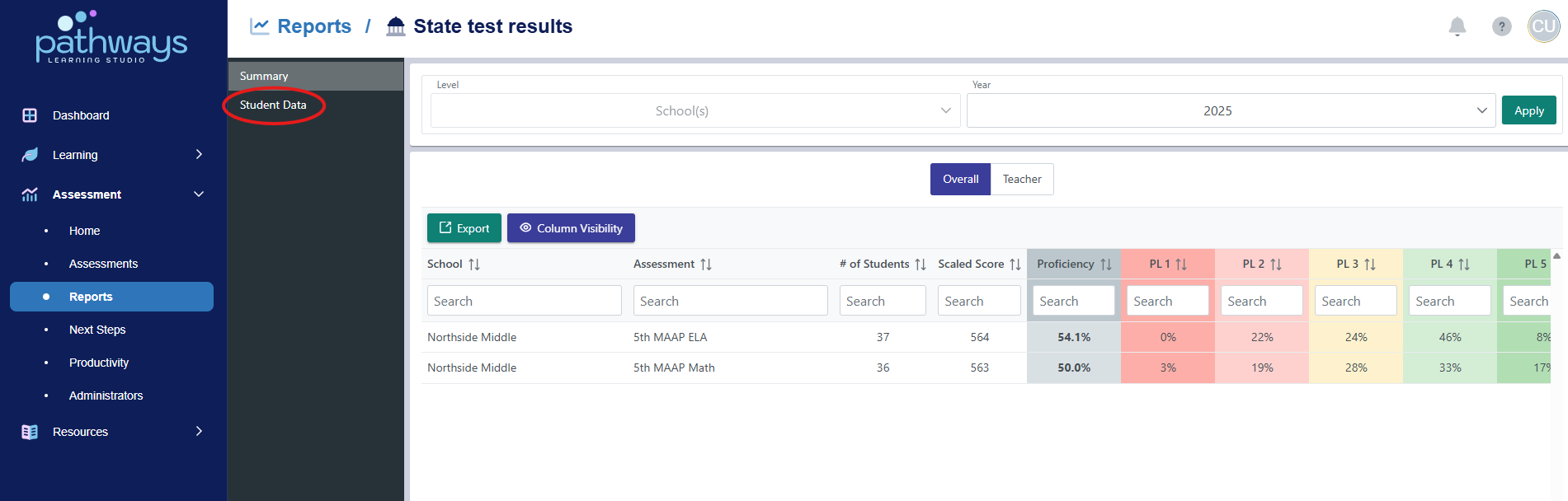 7. View each student’s scaled score and PL from the state assessment. Choose ‘export’ to download the data into a spreadsheet. Choose ‘Column Visibility’ to choose which data points show on the table. To sort by a column, click the title of that column.