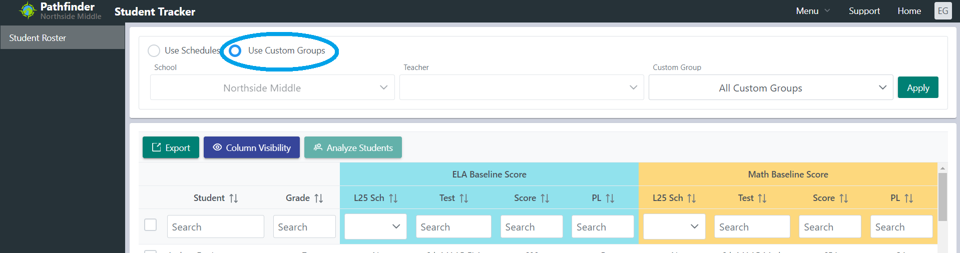 If you are not the main teacher in the classroom, choose ‘Use Custom Groups’ to find your student. If you are not assigned to a custom group, ask your administrator to create a custom student group with the students that you need to access.