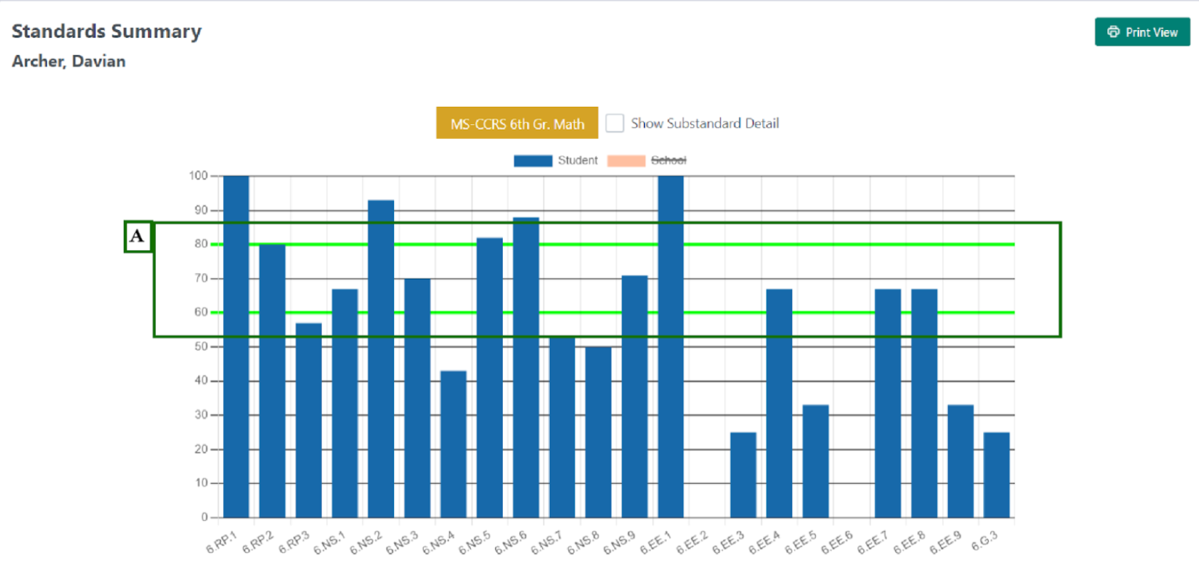 - The green lines at 60% and 80% provide a frame of reference for educators to measure content mastery for standards. On benchmark assessments, generally speaking, 60% represents proficiency and 80% represents advanced performance.