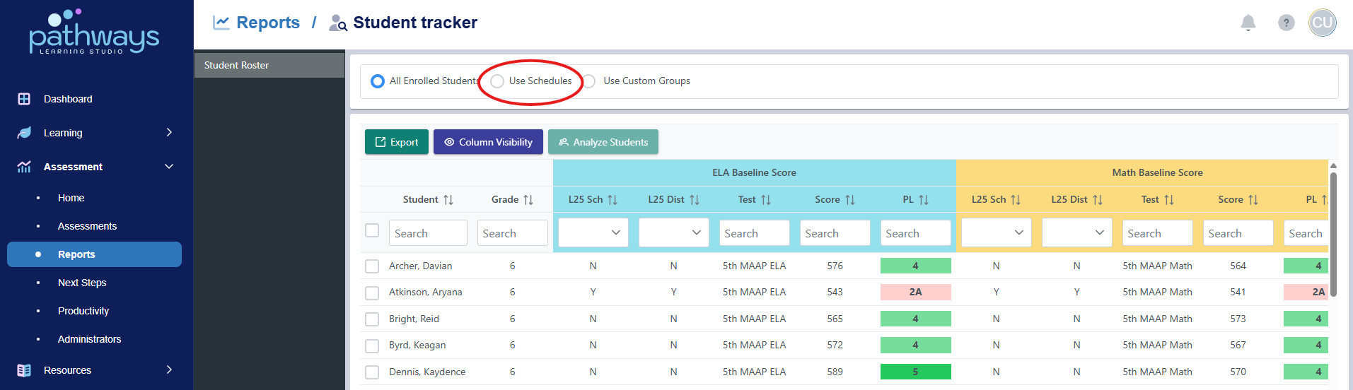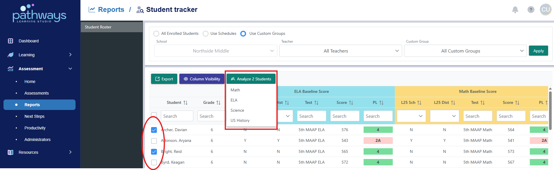 6. Find the student(s) whose results you would like to analyze, and select the box(es) beside their name(s). Select the ‘Analyze Student’ button above the student list and choose the subject.