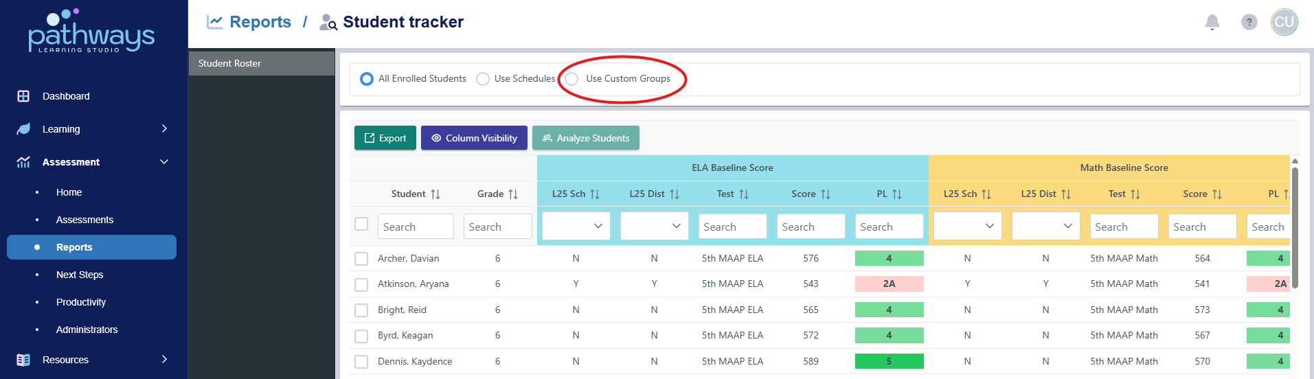 b. If you are not the main teacher in the classroom, choose ‘Use Custom Groups’ to find your student. If you are not assigned to a custom group, ask your administrator to create a custom student group with the students that you need to access.