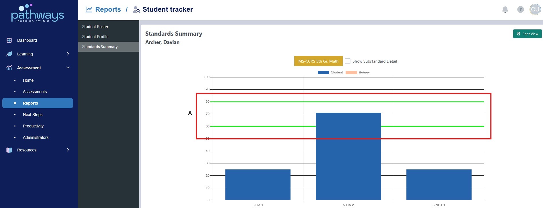 A. The green lines at 60% and 80% provide a frame of reference for educators to measure content mastery for standards. On benchmark assessments, generally speaking, 60% represents proficiency and 80% represents advanced performance.