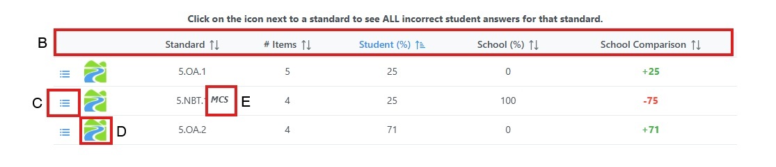 B. Sort the columns by standard, number of items, student percent correct, school percent correct, or school comparison by clicking on the title of that column.
