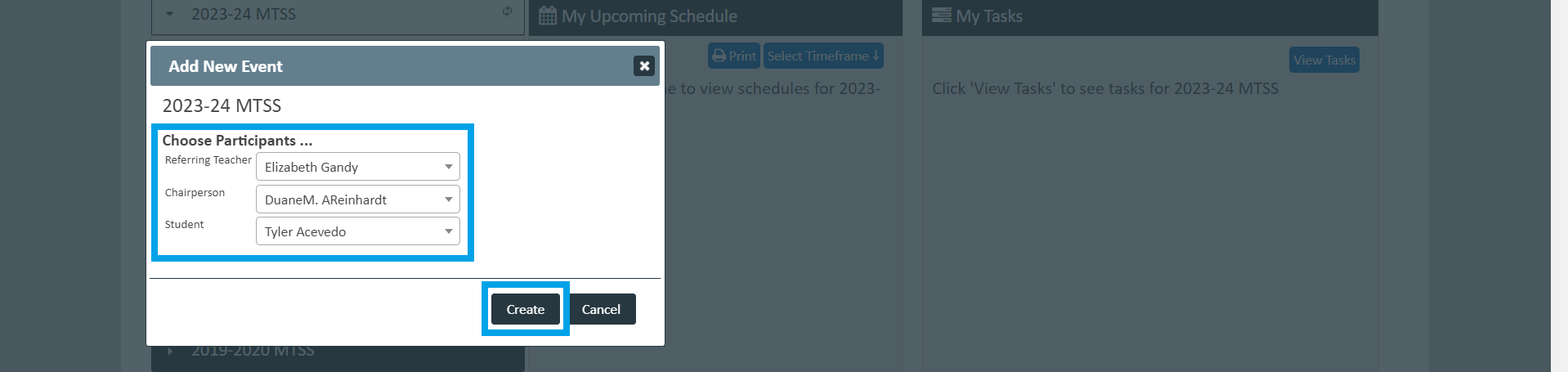 4. Choose the correct teacher, chairperson, and student name, then select ‘Create.’