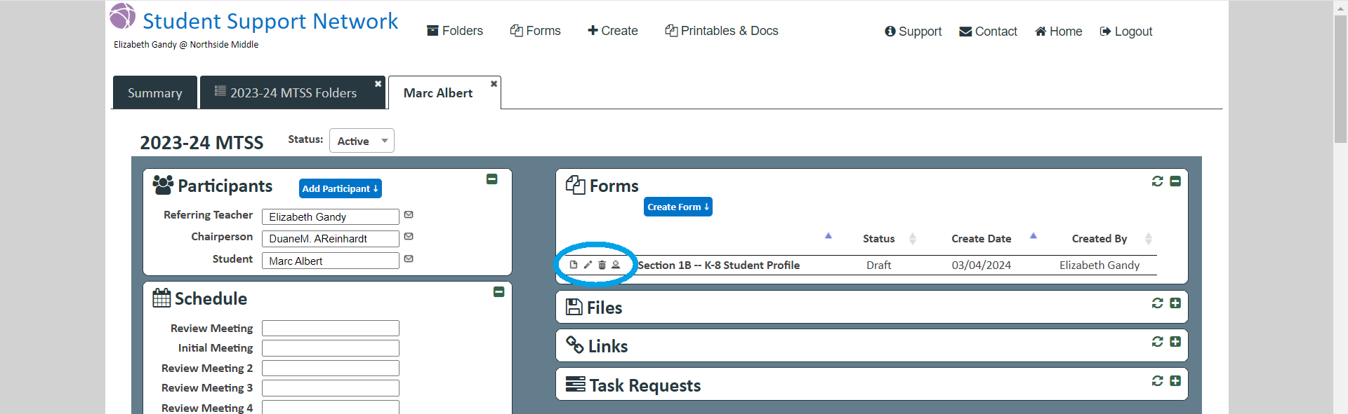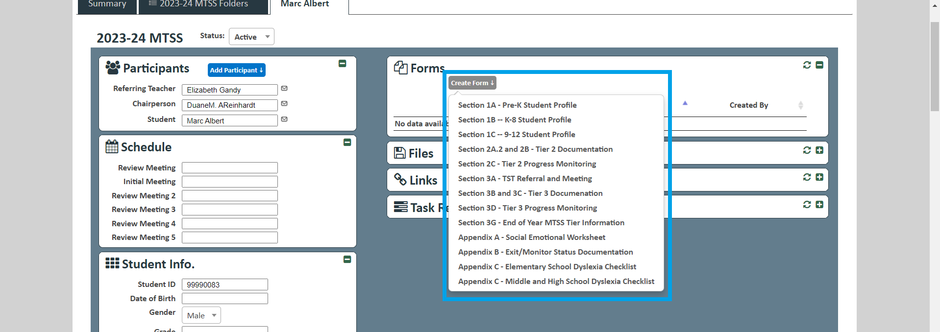4. Choose the folder icon to the left of the student for whom you wish to create a form.