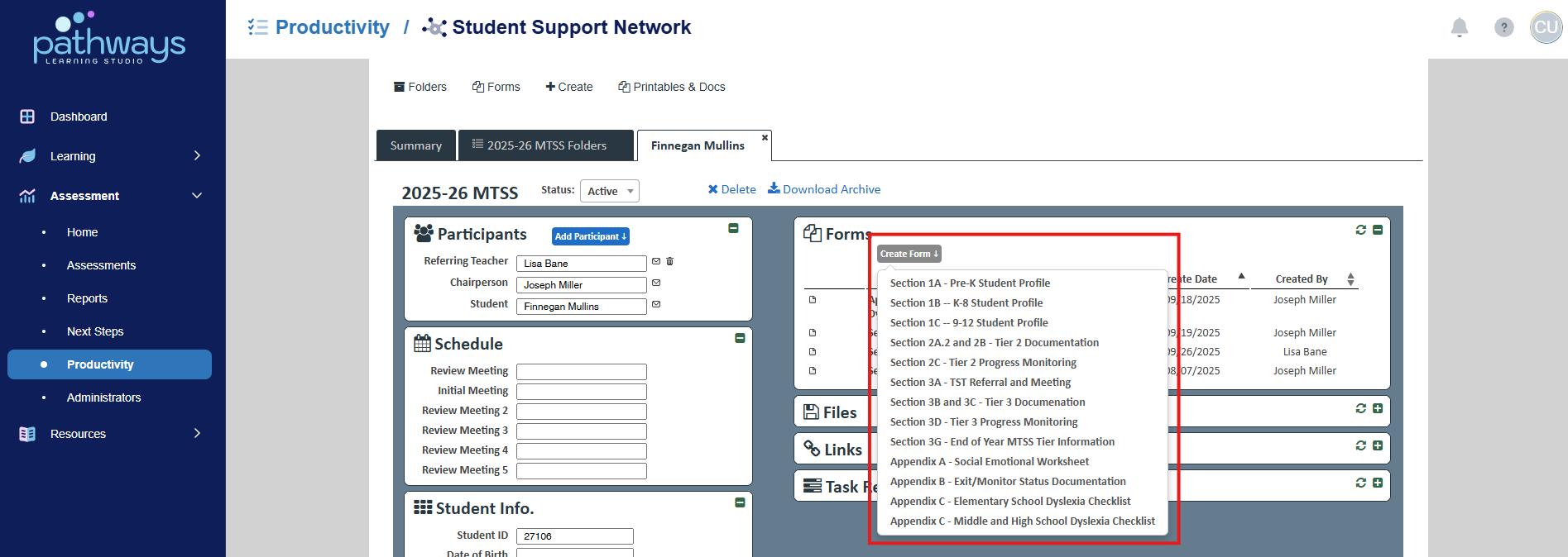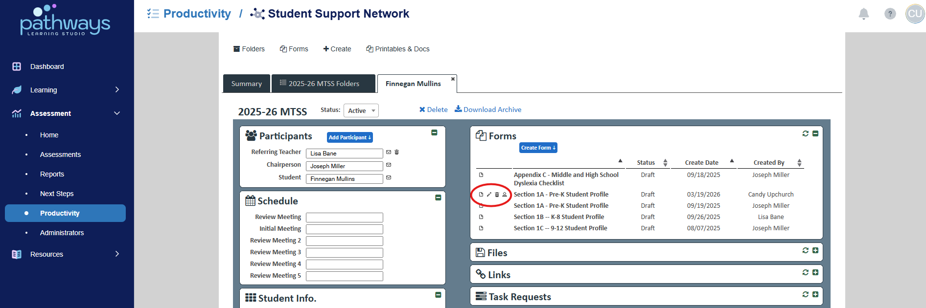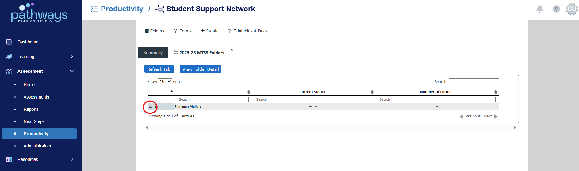 6. Choose the folder icon to the left of the student for whom you wish to create a form.