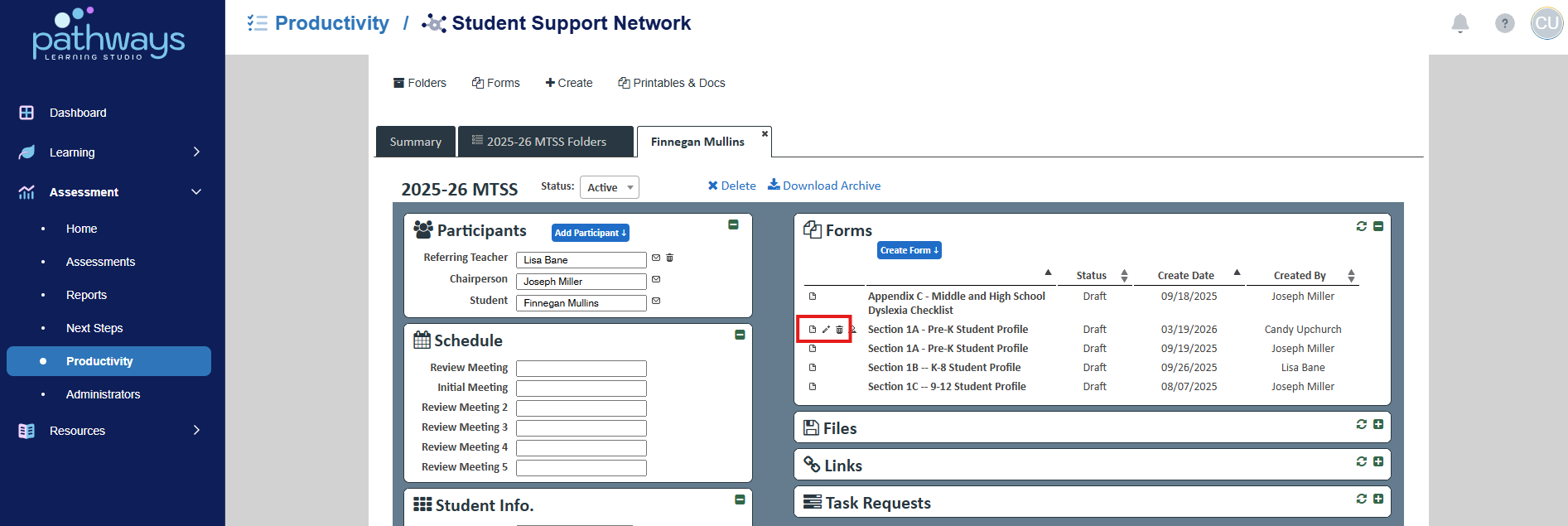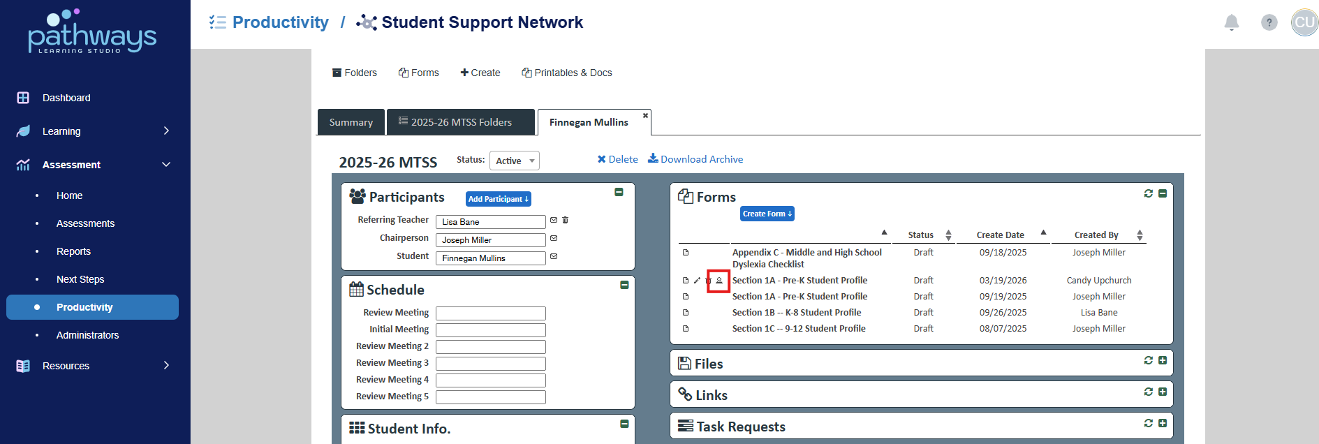 6. Choose the folder icon to the left of the student whose forms you wish to manage.