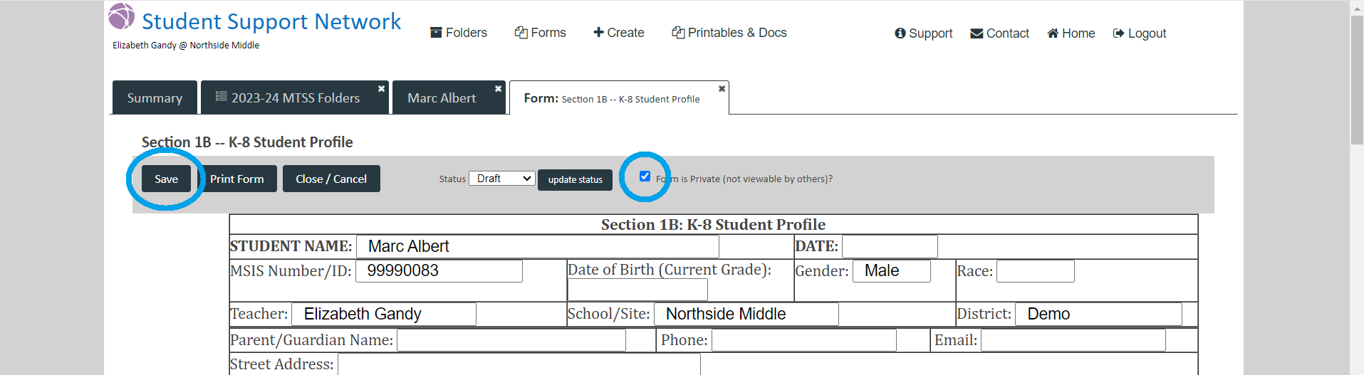 6. Mark the check box beside ‘Form is Private (not viewable by others)’ then select ‘Save.’ This will mean no one other than the owner (not even school administrators) can see the form.