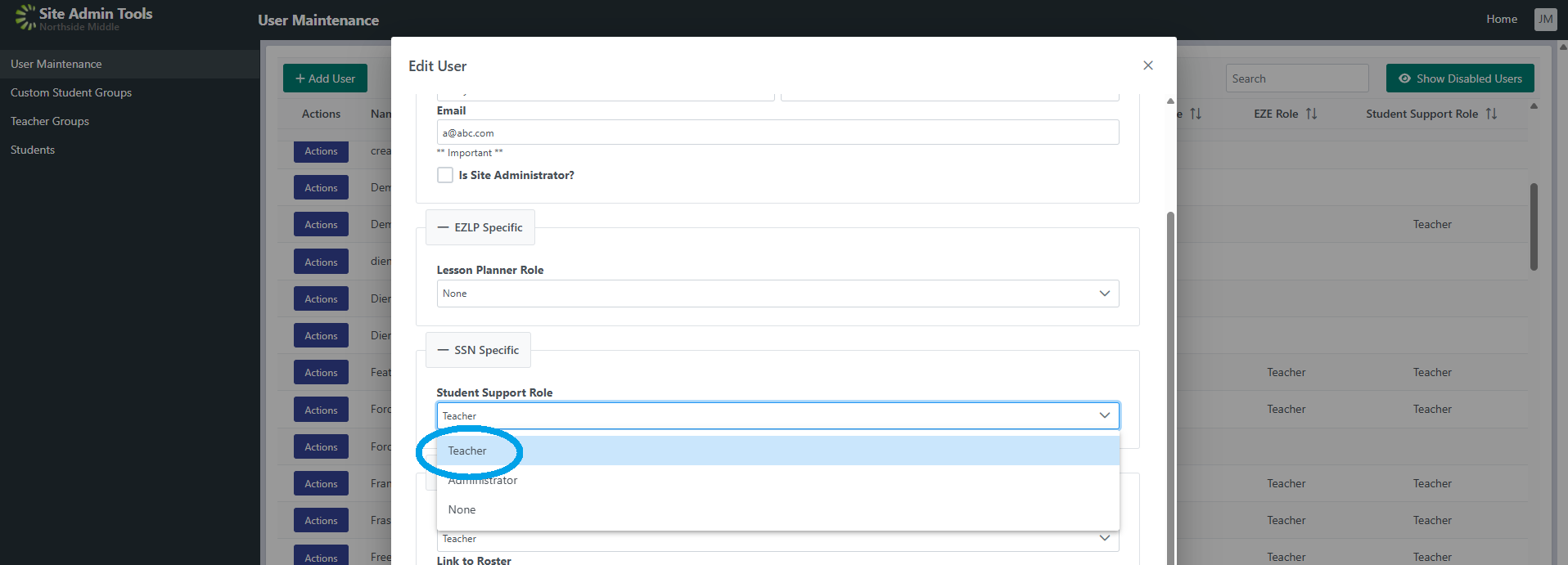 4. Ensure that under the SSN Specific portal, the ‘Student Support Role’ is set to ‘Teacher.’