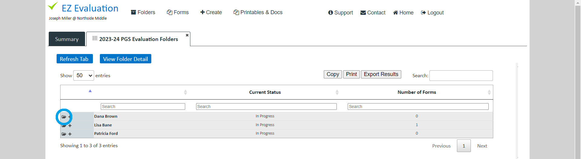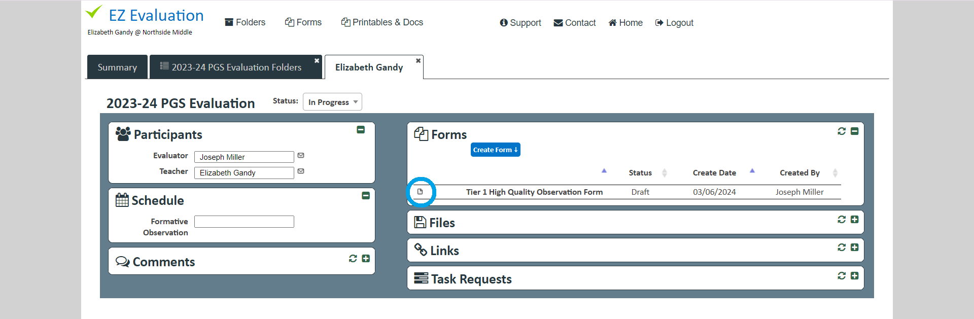 5. Select the document icon to the left of the evaluation title to view the evaluation. If you do not see the evaluation you are looking for, it likely means that your administrator has marked it as private or has not created the form yet.