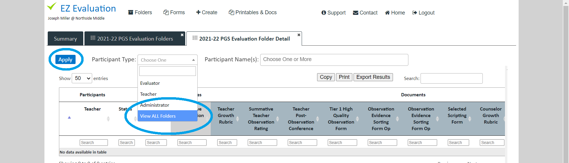 5. Choose ‘View ALL Folders’ in the drop down menu under ‘Participant Type,’ choose ‘Okay’ on the pop up that warns it will take 30 seconds to load, and then select ‘Apply.’
