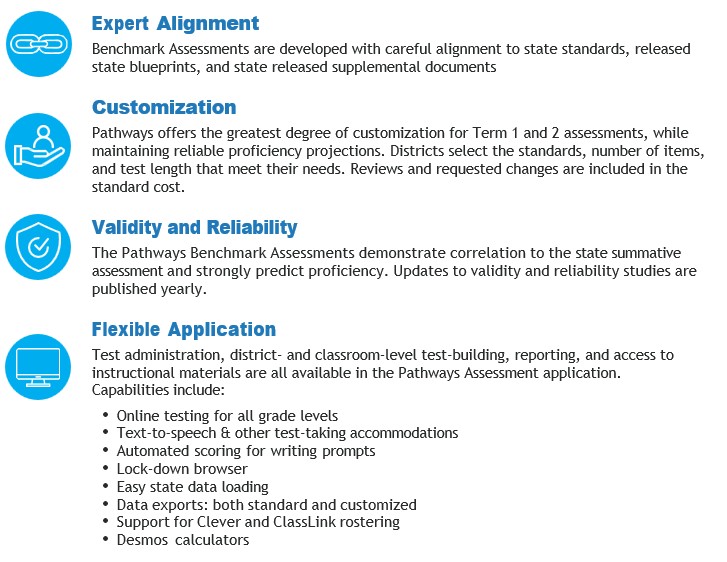 Pathways Assessment is a customizable, state assessment aligned benchmark program with fast-turnaround projections, pre-built formative assessments, and resources to support next-step instruction.