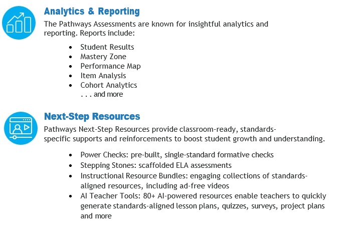Pathways Assessment enables districts to measure student proficiency on state assessed standards while accommodating varied instructional pacing. Combined with pre-built formative assessments, extensive item banks, standards-aligned instructional resources, and actionable analytics, Pathways Assessment equips educators with the tools needed to monitor student growth, inform instruction, and promote meaningful academic success.
