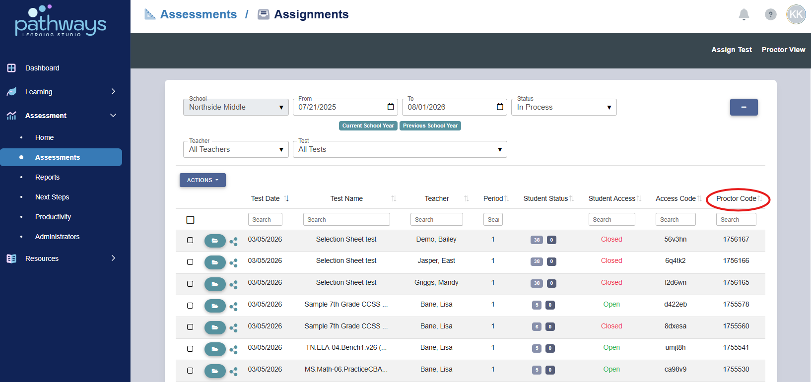 5. Locate the assignment of the proctor code you wish to view. The proctor code is located in the far right column.