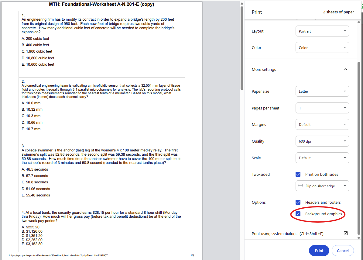 c. Ensure that ‘Background Graphics’ is on before printing.