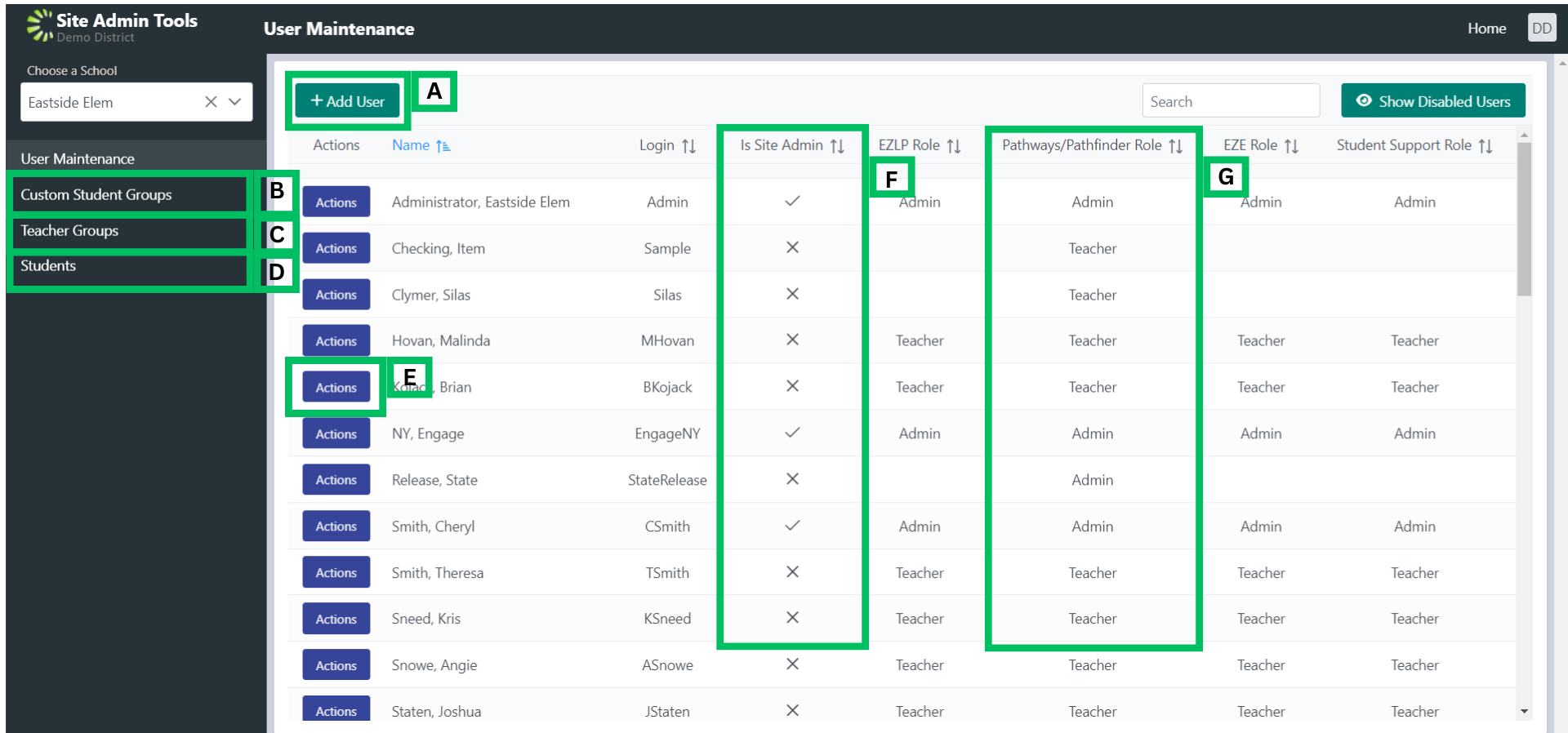 A. Add User - create a new account for a teacher or administrator. If you want the new user to have access to single sign on through Clever or ClassLink, contact Pathways support through chat, email, or phone. You will only need to add a user manually if your district is not using single sign on.