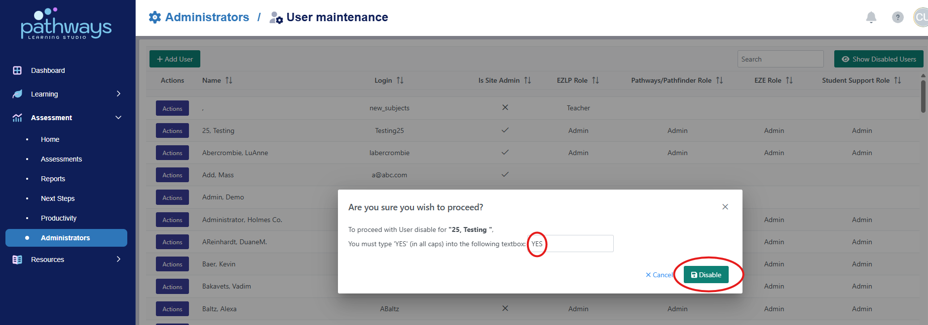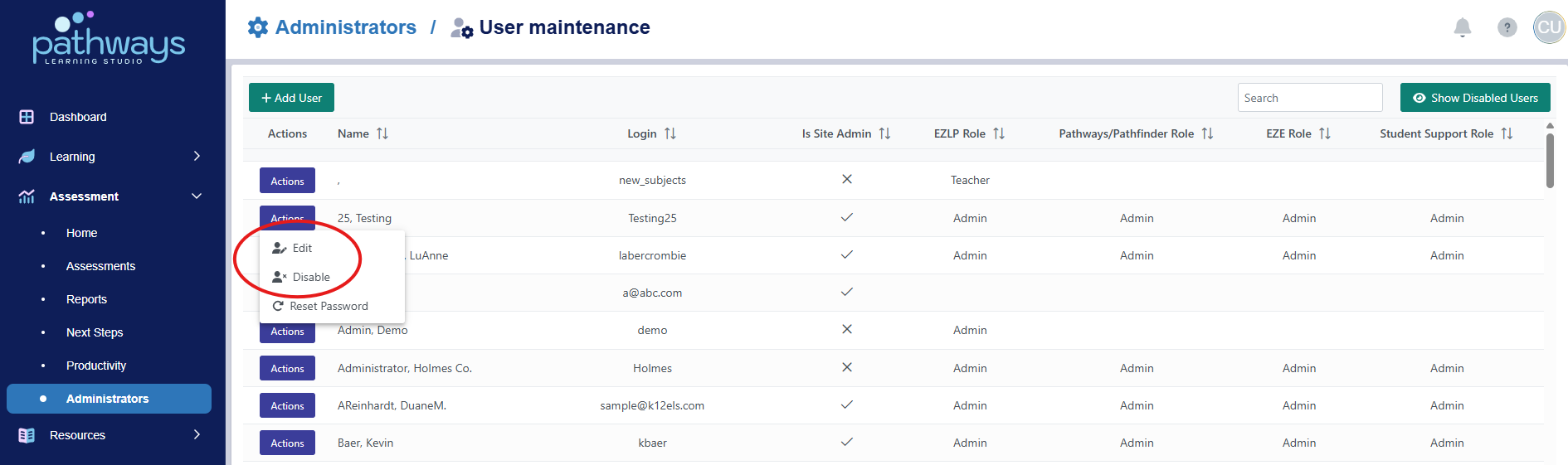 6. Locate the user you would like to enable or disable, and select 'disable' or 'enable' from the 'Actions' drop down menu beside the user's name.