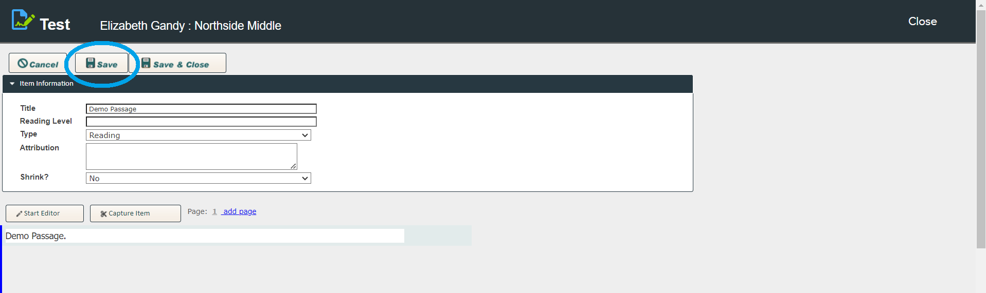 9. To save the passage, choose 'Save' or 'Save and Close' from the top of the page.