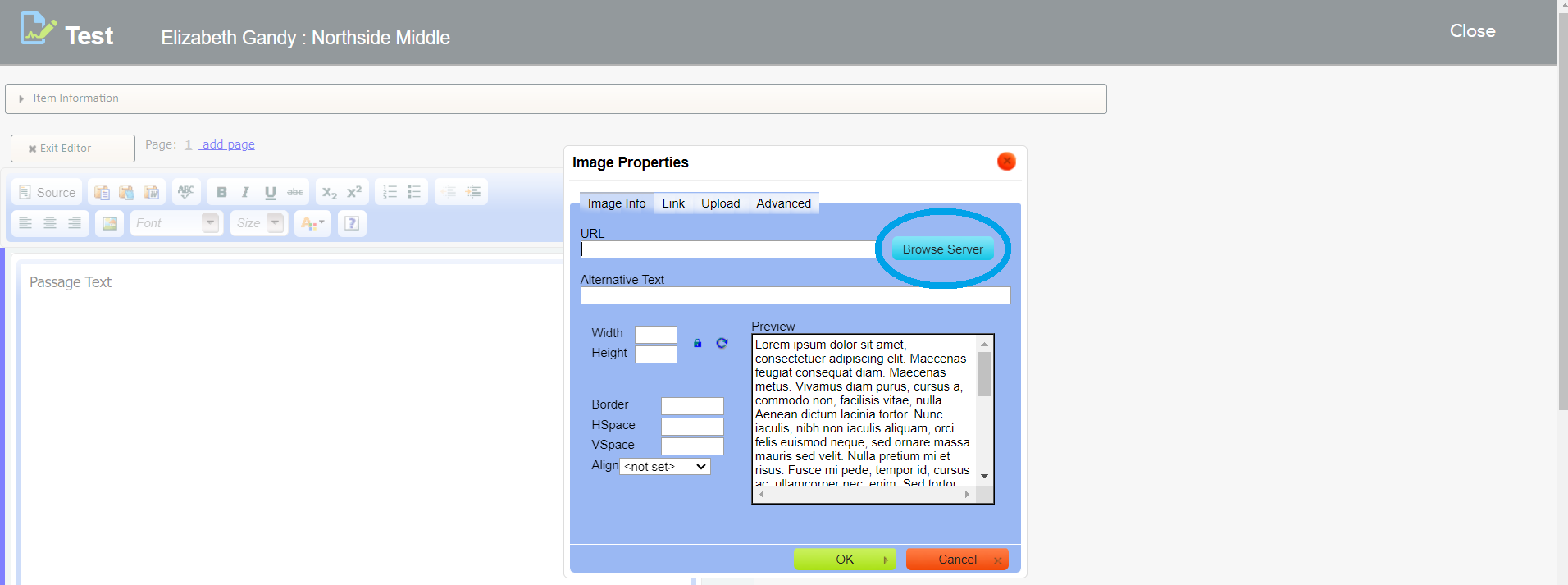 7. To find the image you would like to add, select 'Browse Server.' Do not copy and paste a URL; an image inserted with this method will not show up on the student's test browser.