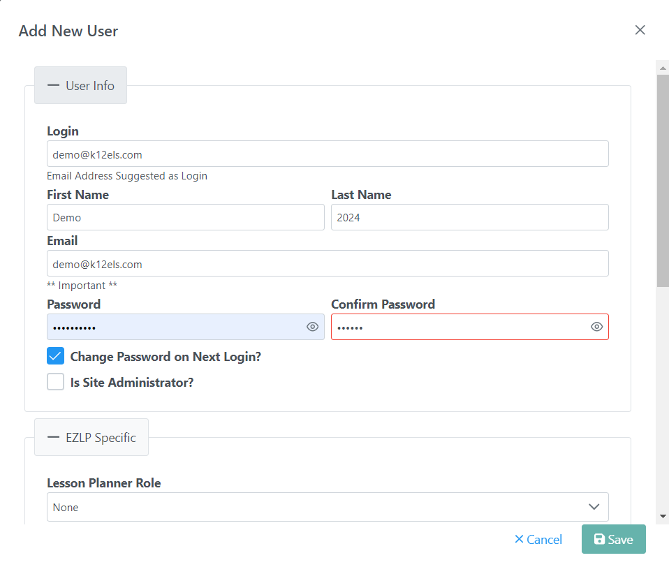 7. After creating the user's account, you will need to provide them with their login ID and password. There is not currently an automatic notification system in place for new users.
