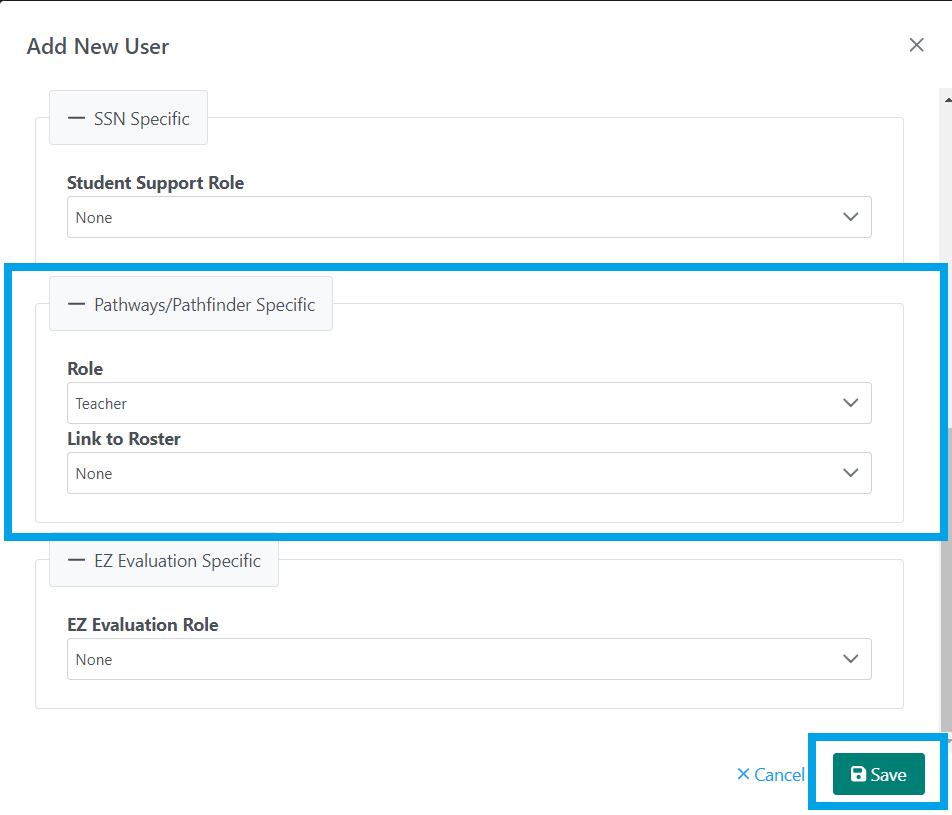 6. Under Pathways/Pathfinder Specific, choose the role of the user. If creating a teacher account, the name of the teacher should be selected in the 'Link to Roster' drop-down (only applicable for teacher accounts). By saving, you create the new user.