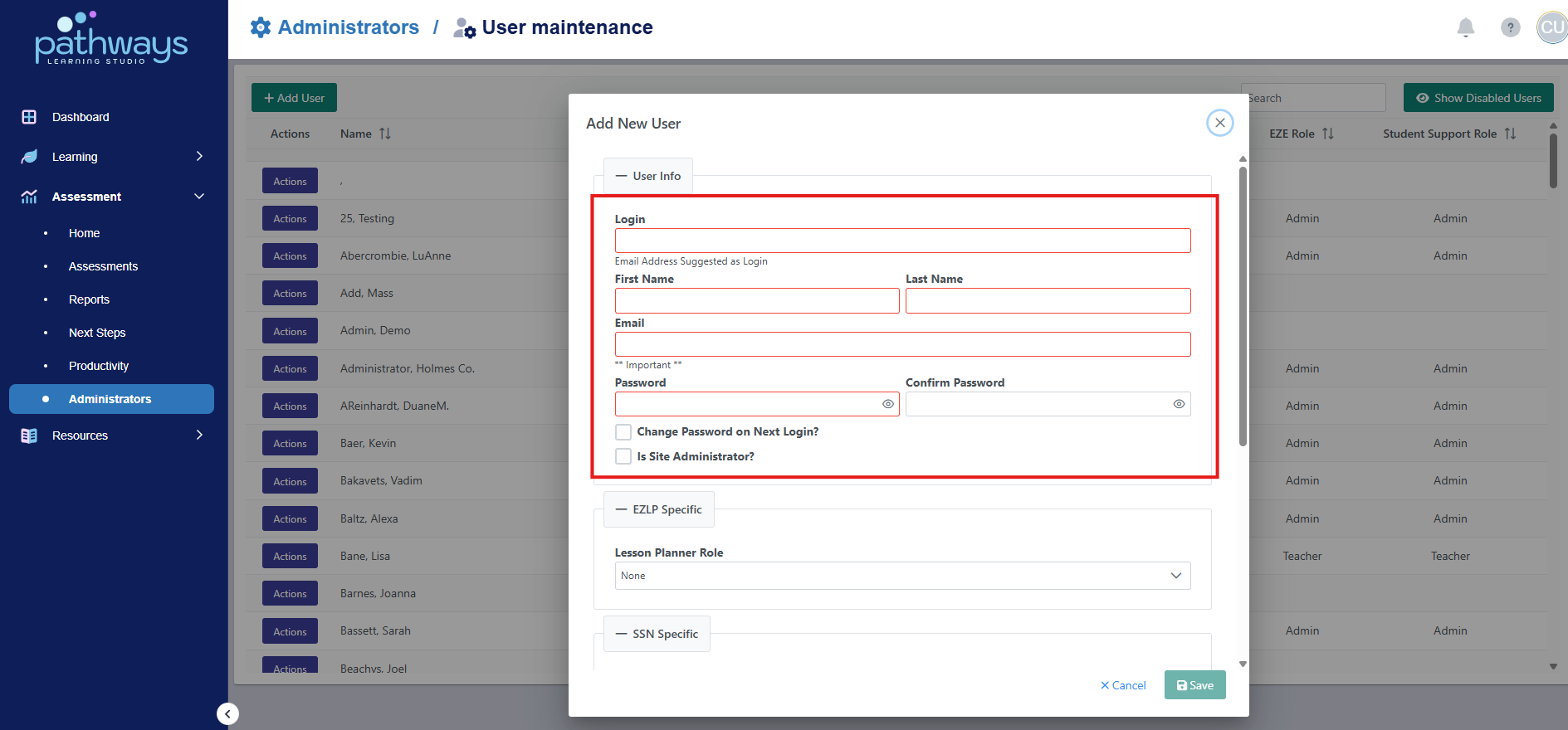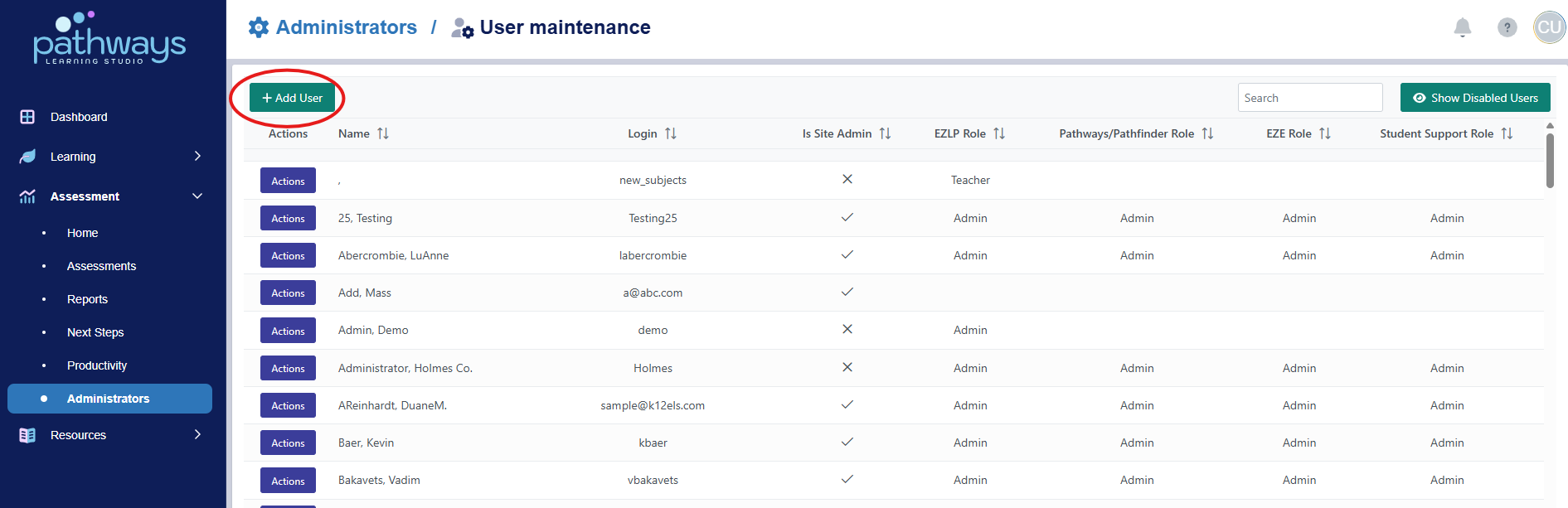 9. After creating the user's account, you will need to provide them with their password and school code. There is not currently an automatic notification system in place for new user accounts that are created. If your district utilizes Clever or ClassLink single sign-on and you would like the user for the account you created to be able to access Pathways Assessment via Clever or ClassLink, please contact Pathways Assessment support.
