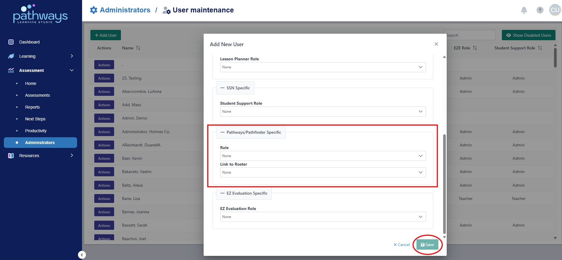 8. Under Pathways/Pathfinder Specific, choose the role of the user. If creating a teacher account, the name of the teacher should be selected in the 'Link to Roster' drop-down (only applicable for teacher accounts). By saving, you create the new user.