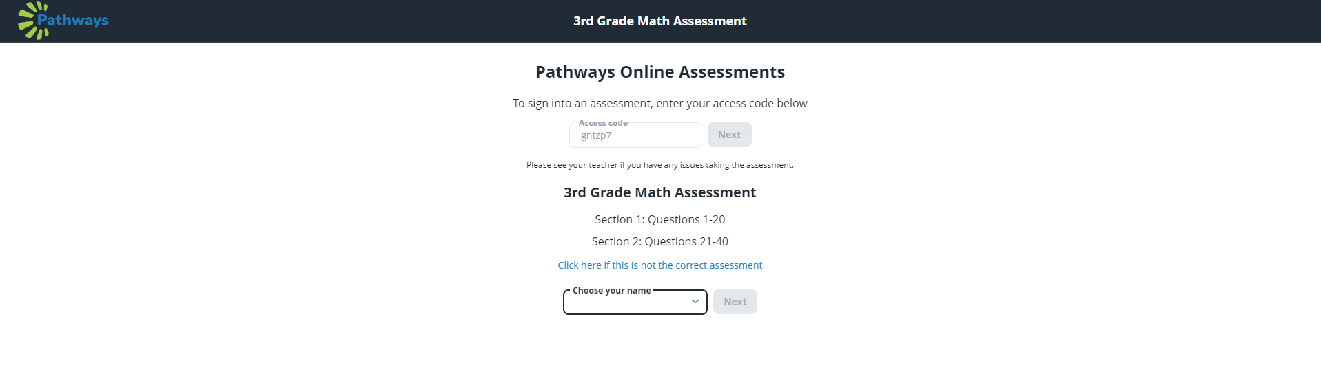 The steps to log a student in for a sectioned assessment are the same as logging a student in for a normal assessment with Pathways. To learn more about this process, see Logging Students in for an Assessment with the OLA Website.