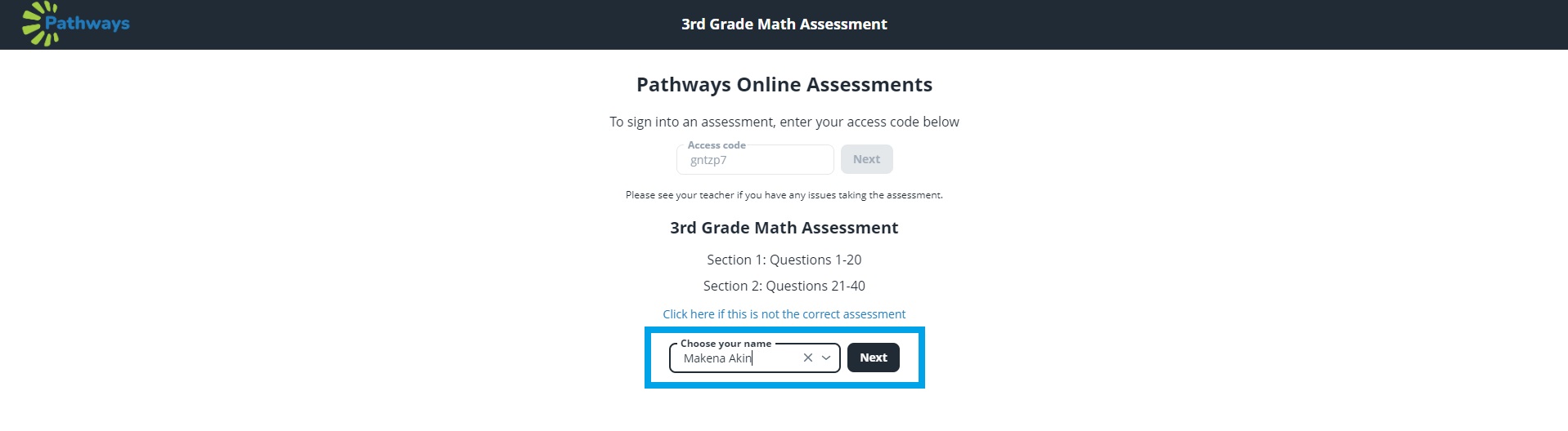 1. Once a student has logged in to a sectioned assessment using their access code, they will see this screen: