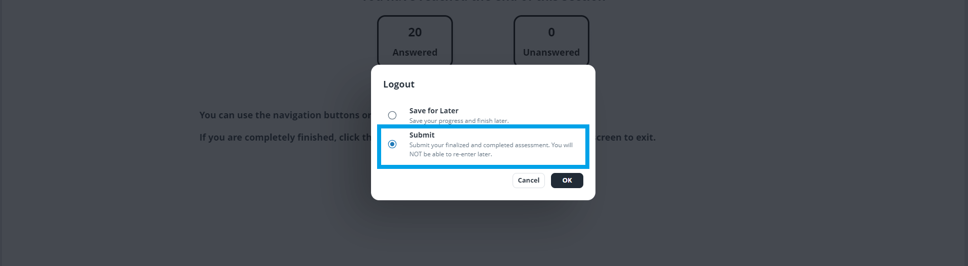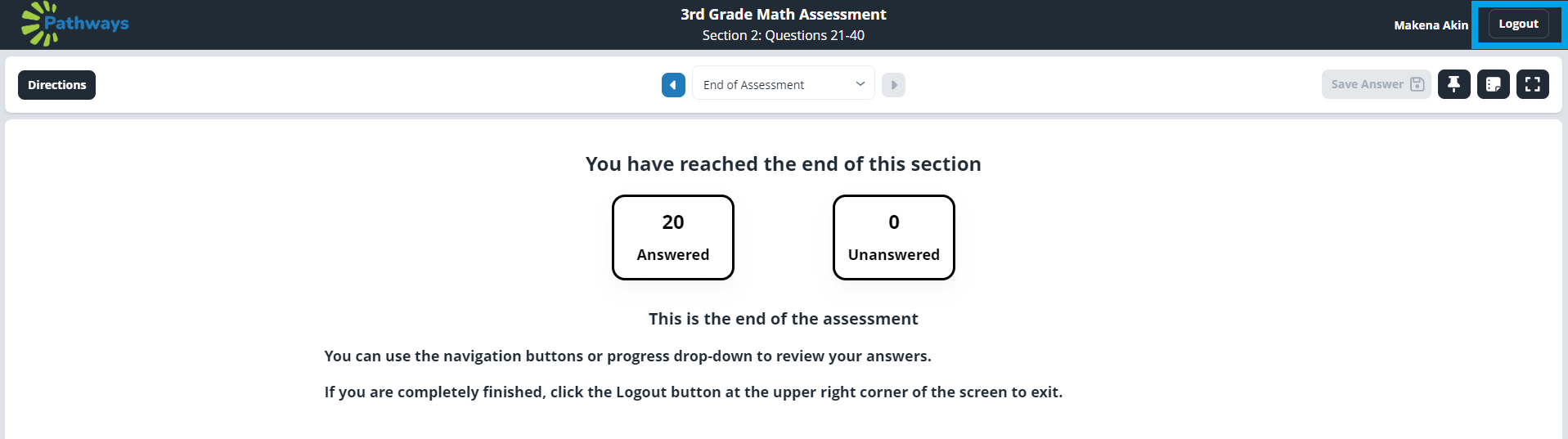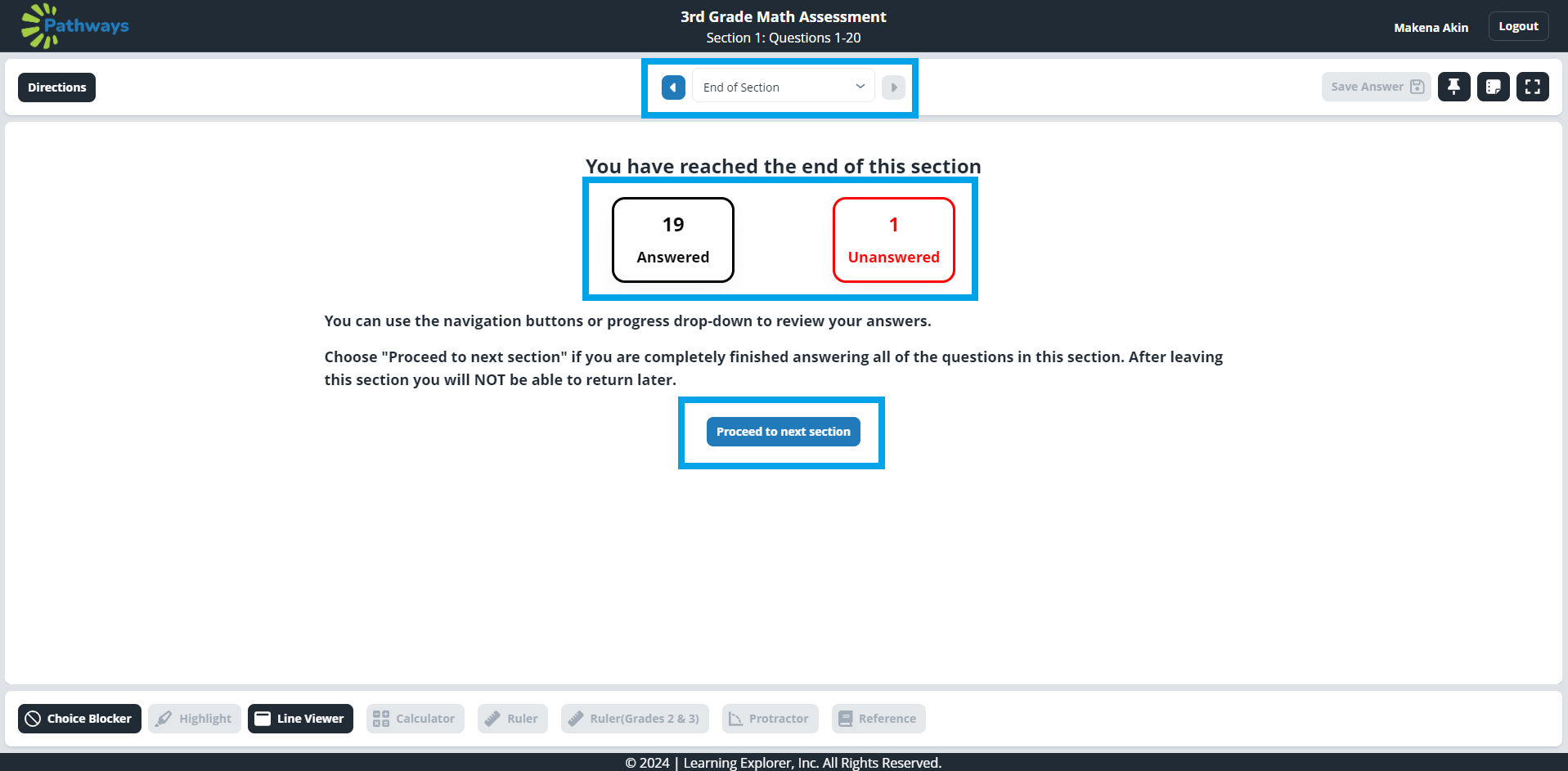 5. Once the student chooses 'Proceed to next section,' they will complete the assessment in the same manner as other assessments. Once complete, they should choose 'Logout' then 'Submit.'