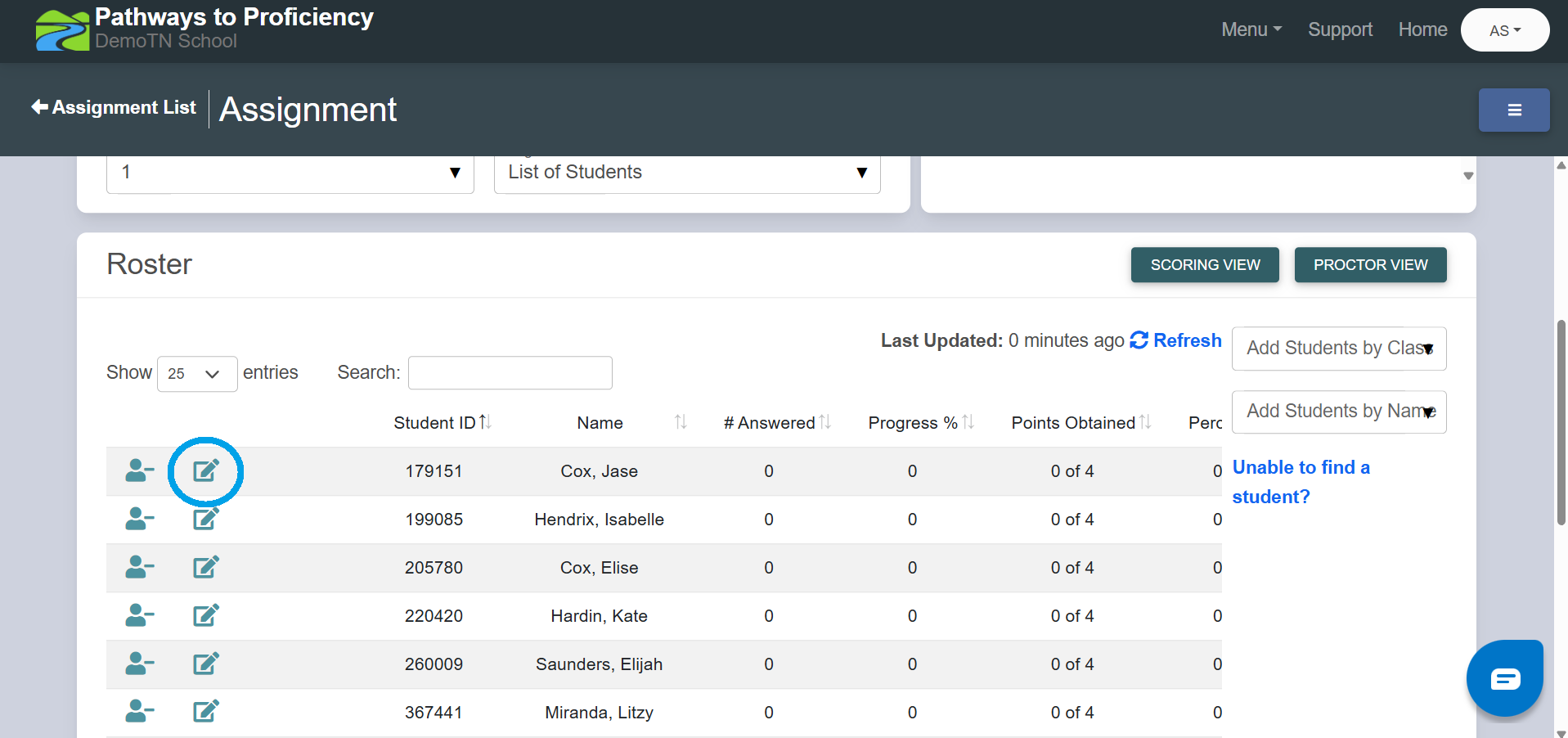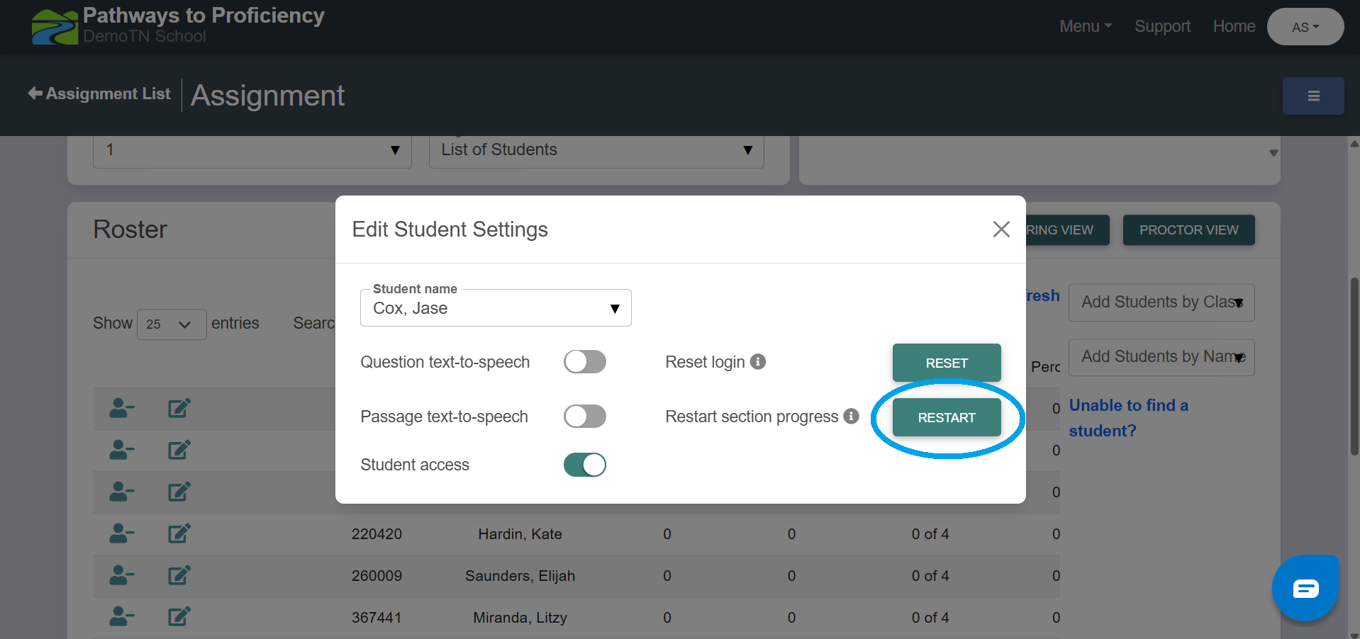 4. If a student proceeds to the next section unintentionally, their test can be reset by logging into your Pathways account and navigating to Pathways to Proficiency -> Measures -> Assignments -> Selecting the folder icon beside the assignment name. Within assignment view, select the edit icon by the student's name, and choose 'Reset Section Progress' in the pop up menu. Once the sections have been reset, the student does not need to log out of their test. They can refresh their screen and be taken back to the correct section.