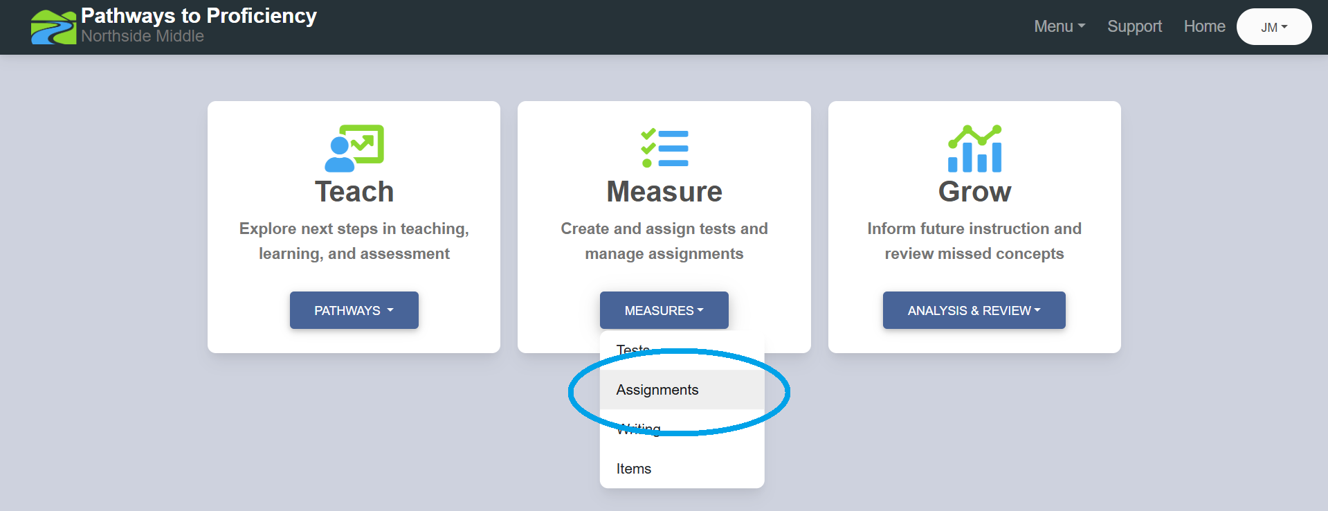 2. Navigate to Pathways to Proficiency -> Measures -> Assignments. Choose the folder icon to the left of the assignment for which you wish to use Secure Browser.