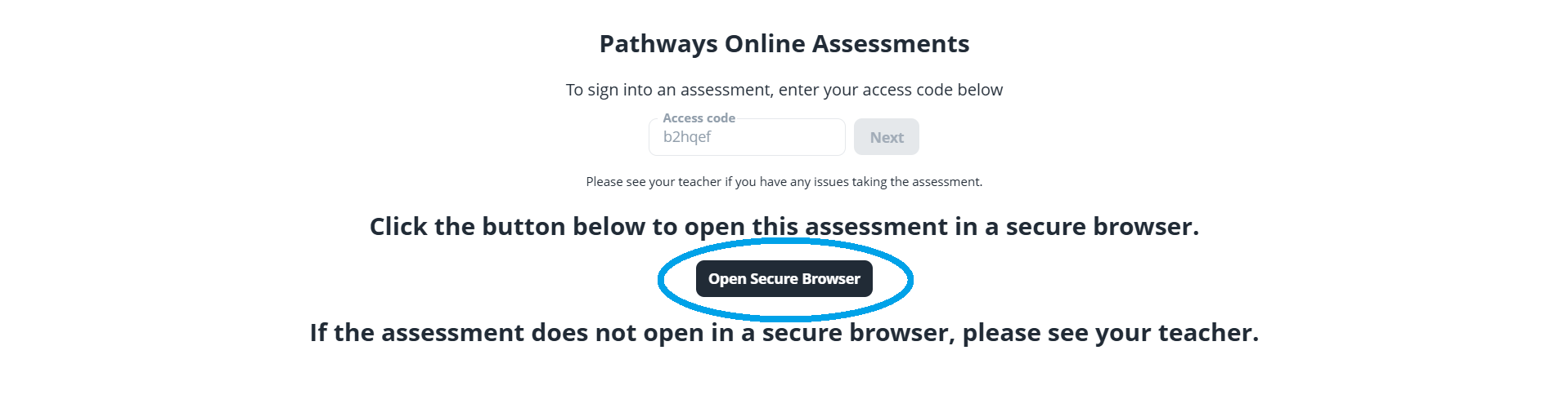 4. Instruct your students to navigate to ola.k12pathways.cloud. If the student is using a Windows, MacOS, or iOS, a button labeled ‘Open Secure Browser’ will display after the student enters the access code for the assignment. When a student selects this button, they will enter the assessment in Secure Browser mode.