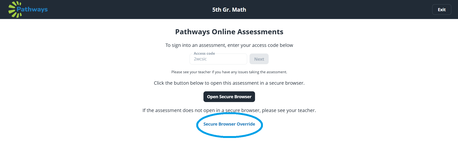 NOTE: If a device is not configured correctly but the student still needs to access the assessment, there is an option to override the secure browser. If the student clicks on 'Secure Browser Override' at the bottom of the page, they will be asked for the proctor code. If the teacher needs to allow a student to access the assessment without the secure browser, they can do so by entering the proctor code. To learn where to find the proctor code, see 'Accessing a Proctor Code.'