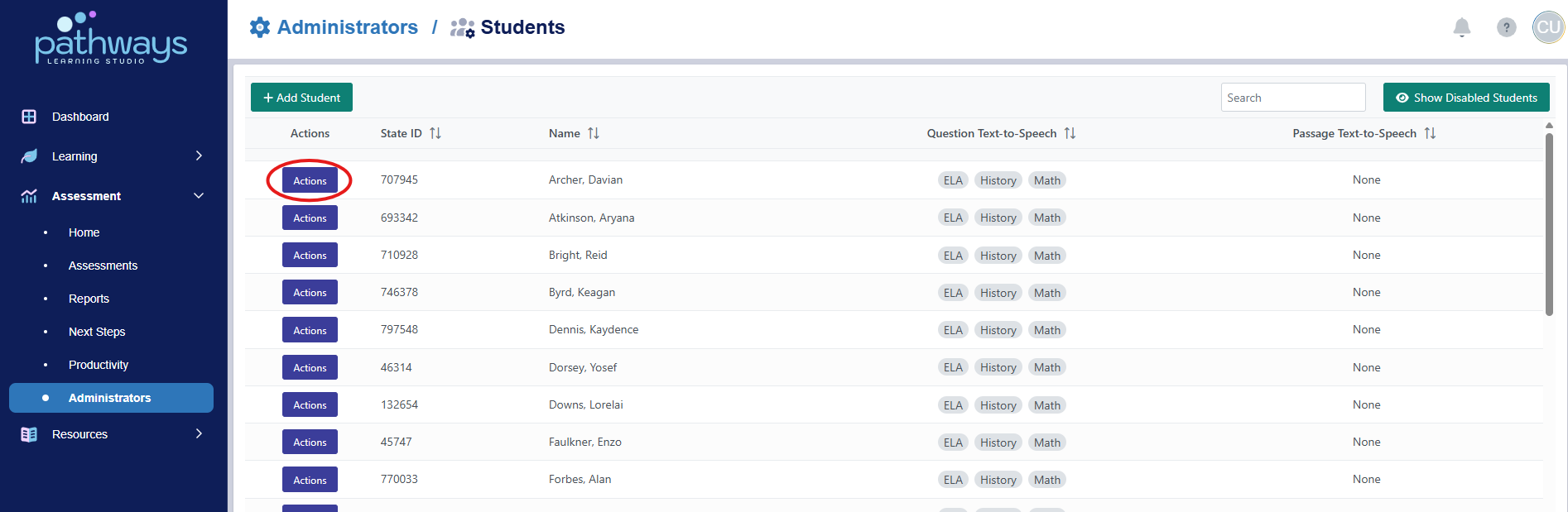 6. Select the blue 'Actions' button to the left of the student's name for whom you wish to activate Text-to-Speech for all assignments and click Edit.