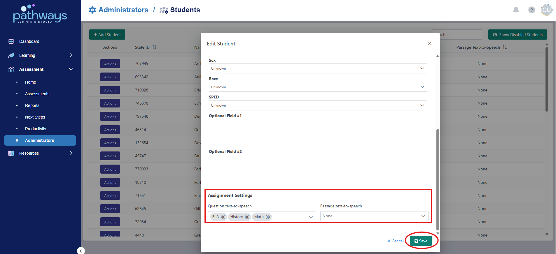 7. Scroll to the bottom of the pop up portal for the student, and select the toggle beside 'Question text-to-speech' and/or 'Passage text-to-speech' according to which aspects of Text-to-Speech you want available for the student (please note that the MAAP assessments do not allow passage text to speech for any students). When the correct toggles have been selected, press 'Save.'