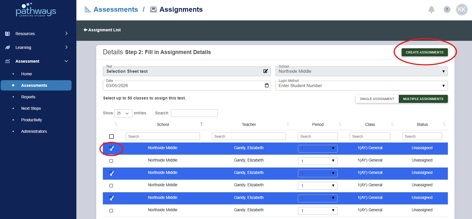Once all classes for which you wish to assign the assessment have been selected, choose 'Create Assignments.'
